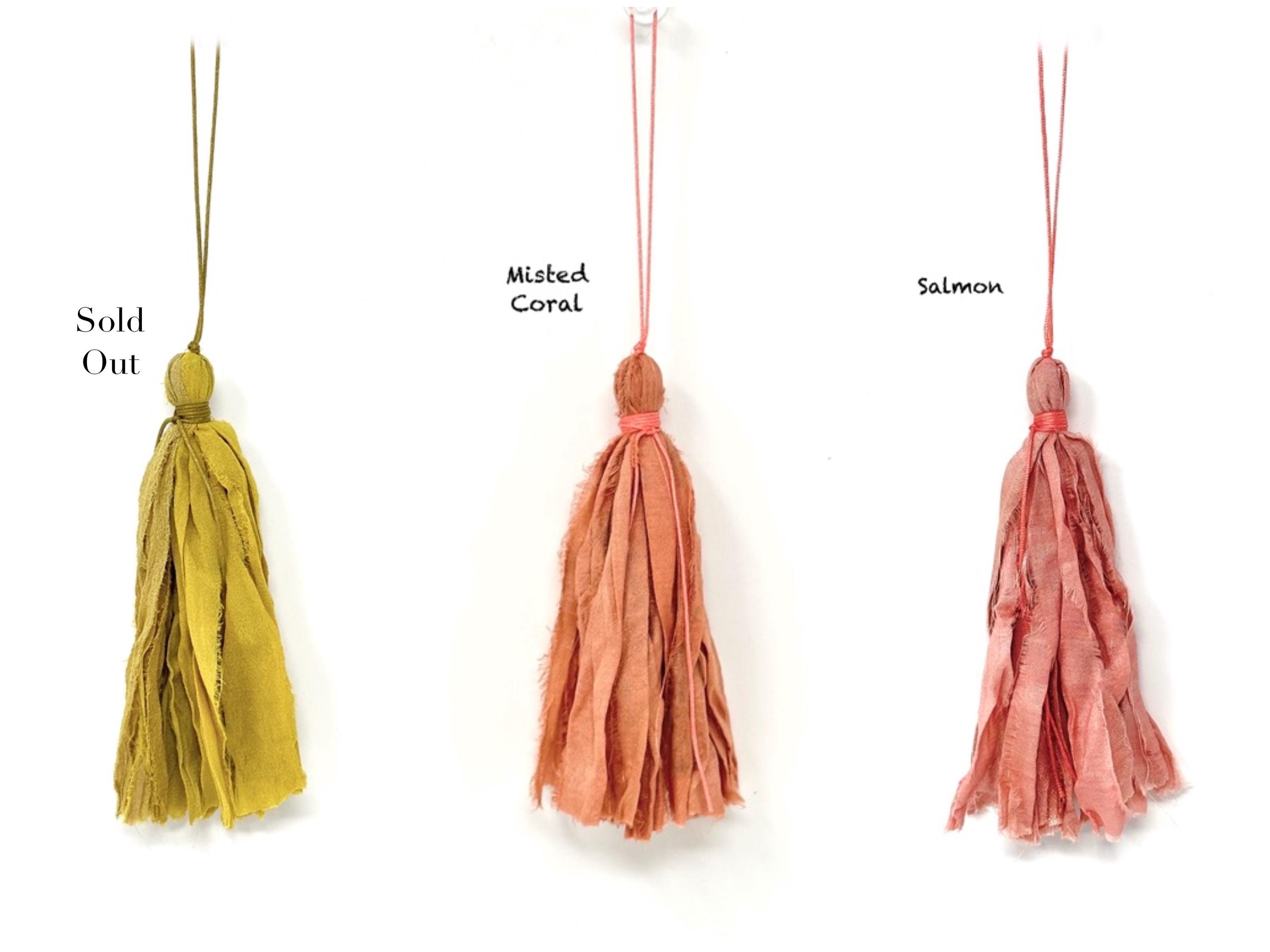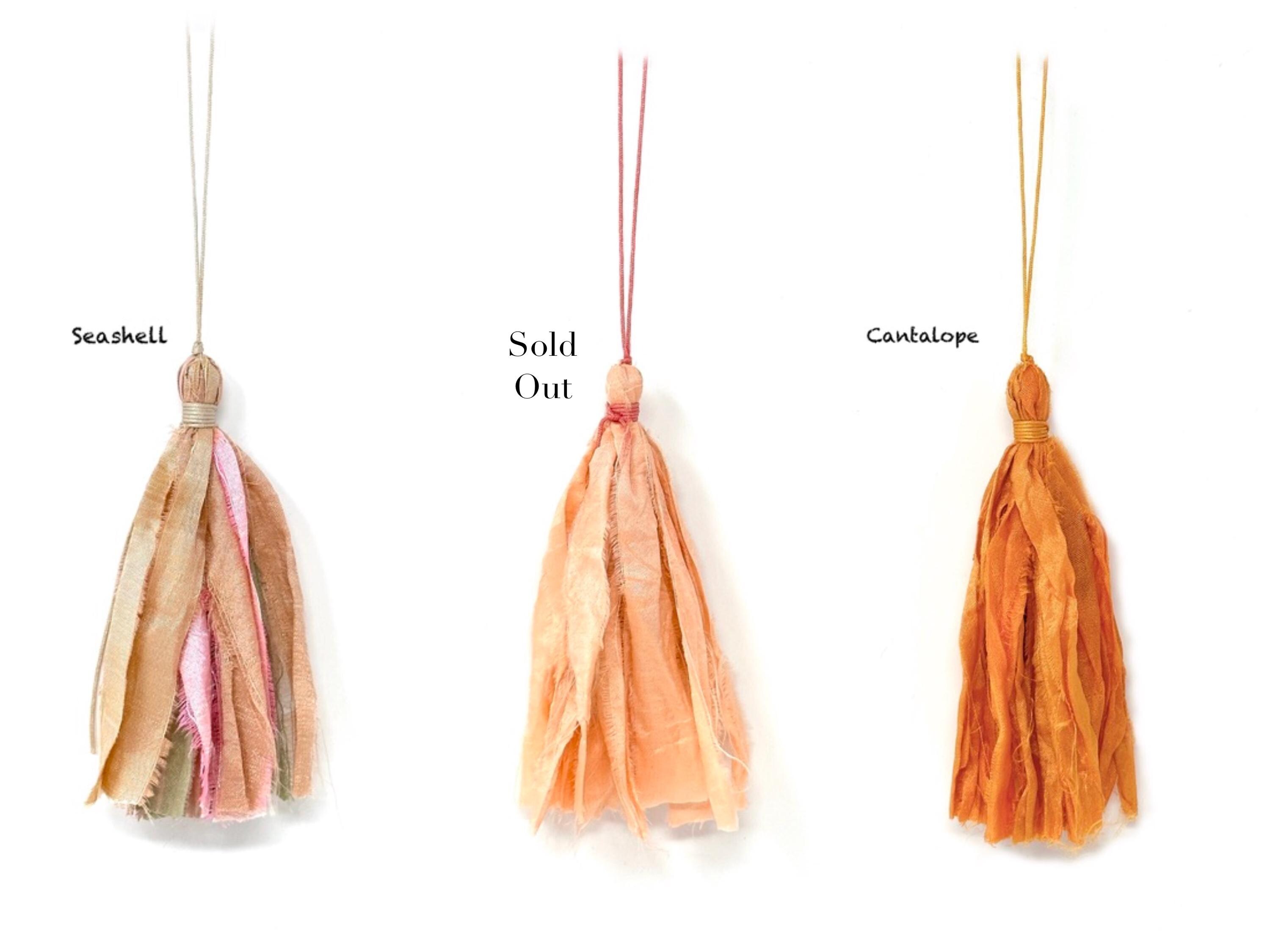 Bring uplifting, vibrant energy to your creations with these handmade Orange & Yellow Sari Silk Tassels. Each tassel is made from recycled sari silk fabric remnants from India, offering soft texture, rich movement, and naturally varied color depth. These tassels measure approximately 4" long (not including your chosen attachment), and because I make each one by hand, you can request adjustments to length, fullness, or cord color to perfectly suit your design.