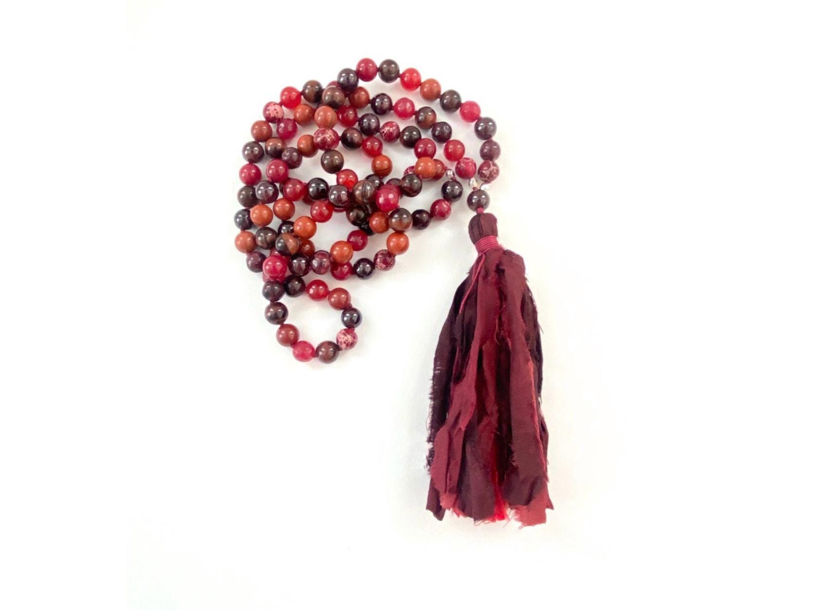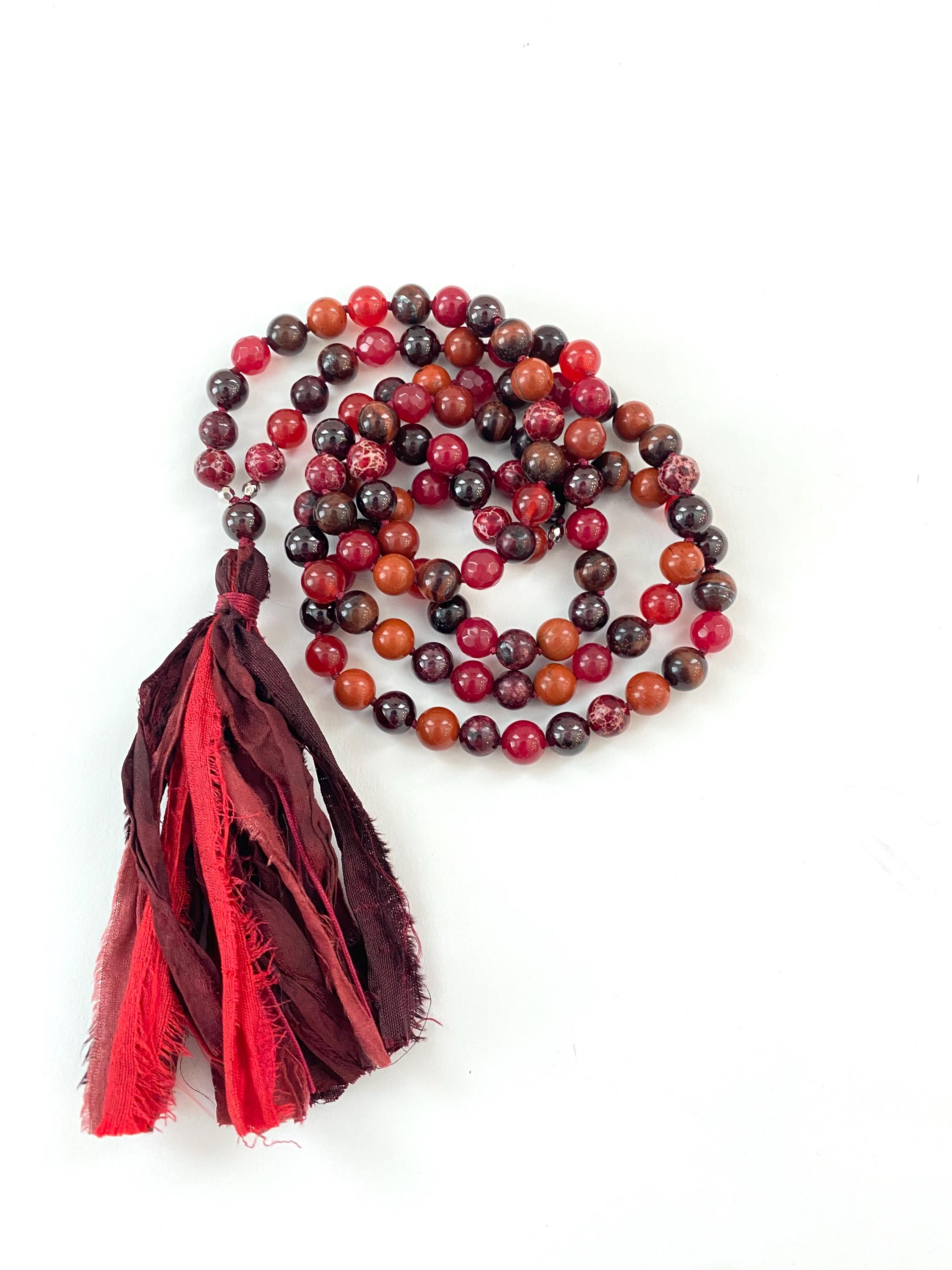 Grounding and strengthening, this 108 bead Mala necklace is part of the Chakra-inspired collection and is hand-knotted from Garnet, Red Brecciated Jasper, Jade, Red Jasper, and Red Sea Sediment, finished with a soft sari silk tassel. These stones are often associated with the Root Chakra—Garnet with vitality, Brecciated Jasper with stability, Jade with balance, Red Jasper with strength, and Red Sea Sediment with resilience. Both meaningful and bold, this Mala is a beautiful companion for meditation, mindfulness, or as a distinctive jewelry piece. A variety of different tassel choices are available, you choose the look you like best