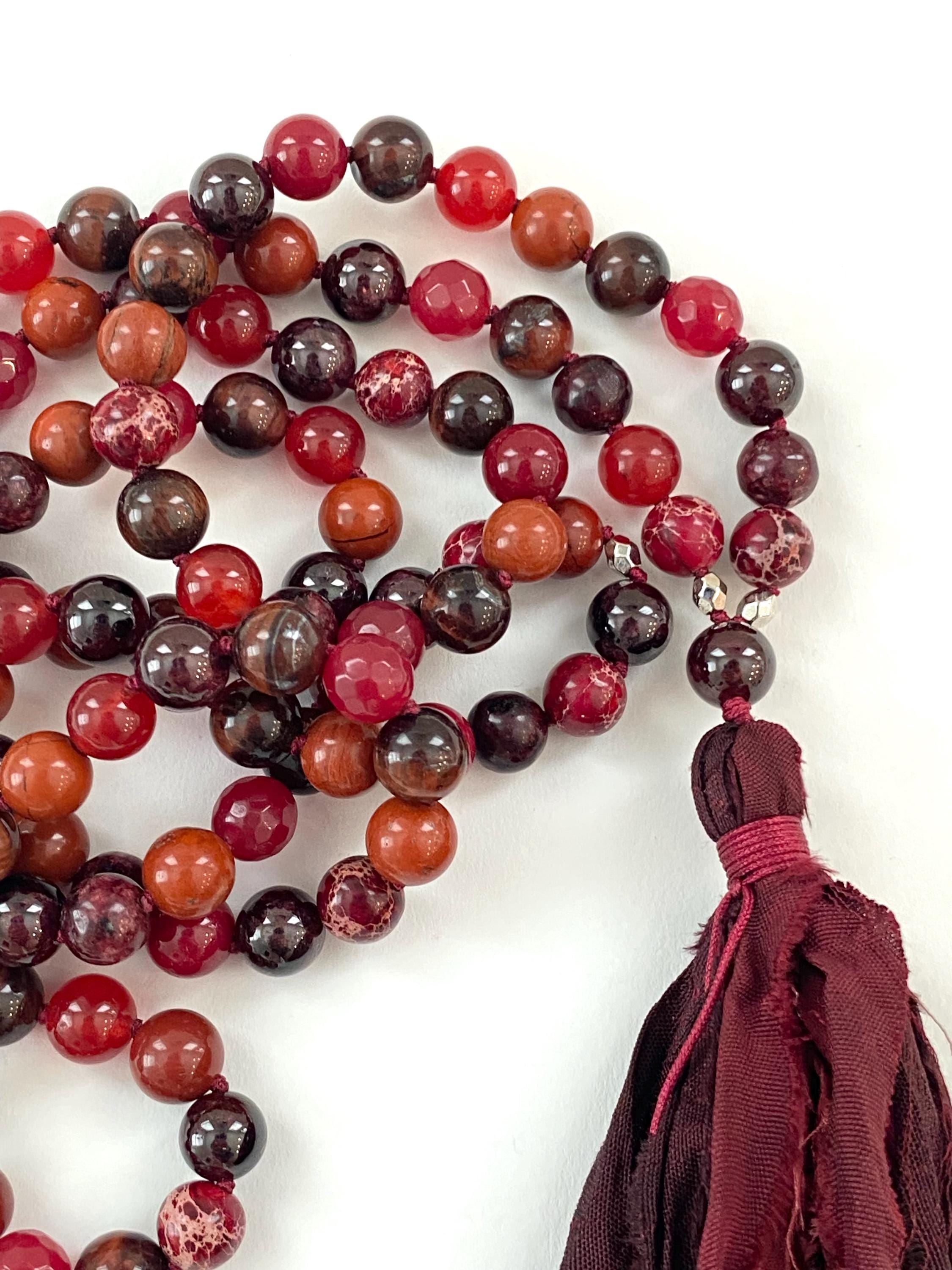 Grounding and strengthening, this 108 bead Mala necklace is part of the Chakra-inspired collection and is hand-knotted from Garnet, Red Brecciated Jasper, Jade, Red Jasper, and Red Sea Sediment, finished with a soft sari silk tassel. These stones are often associated with the Root Chakra—Garnet with vitality, Brecciated Jasper with stability, Jade with balance, Red Jasper with strength, and Red Sea Sediment with resilience. Both meaningful and bold, this Mala is a beautiful companion for meditation, mindfulness, or as a distinctive jewelry piece. A variety of different tassel choices are available, you choose the look you like best