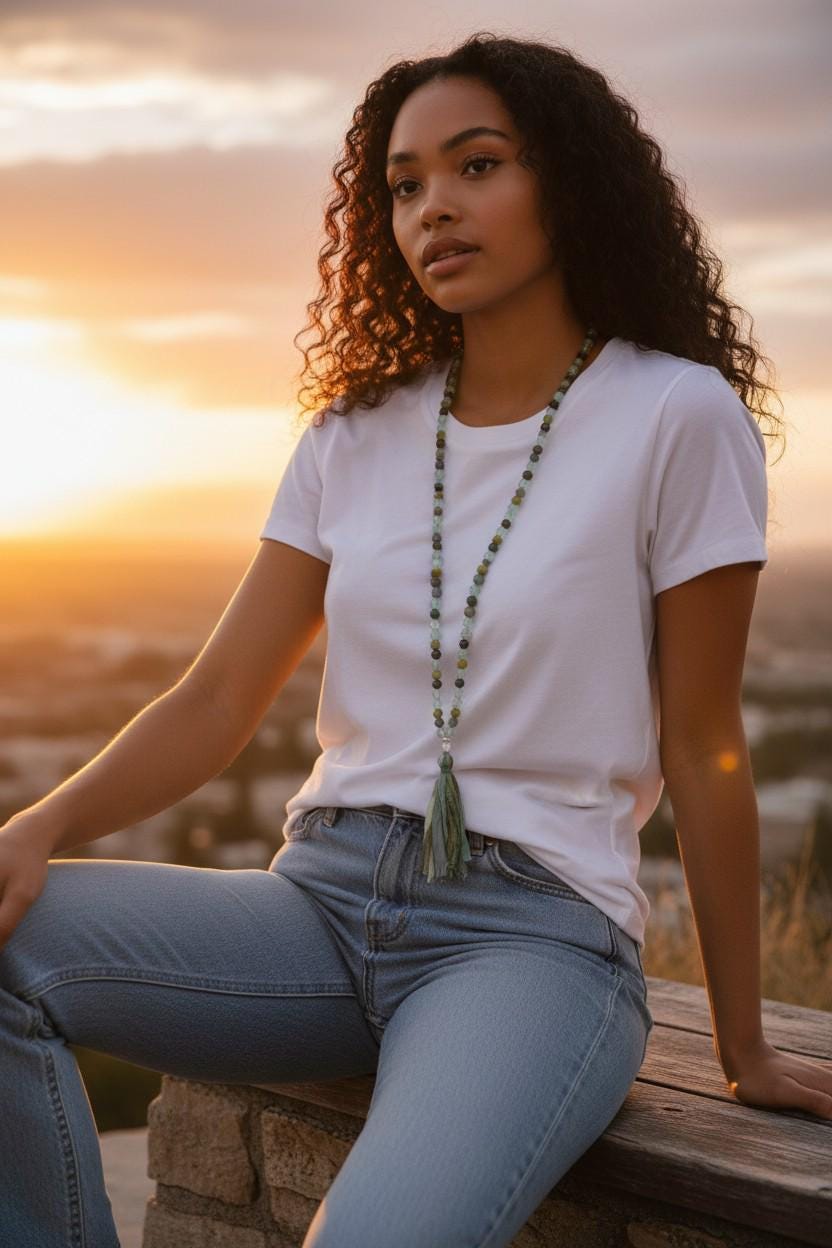 Centered in love and renewal, this 108 bead Mala necklace is part of the Chakra-inspired collection and is hand-knotted from Moss Agate, Fluorite, Jade, Chrysoprase, and Bloodstone, finished with a soft sari silk tassel. These stones are often connected with the Heart Chakra—Moss Agate with growth, Fluorite with harmony, Jade with serenity, Chrysoprase with compassion, and Bloodstone with strength. Meaningful and soothing, this Mala is a beautiful choice for meditation, mindfulness, or as a special jewelry piece. A variety of different tassel choices are available, you choose the look you like best.