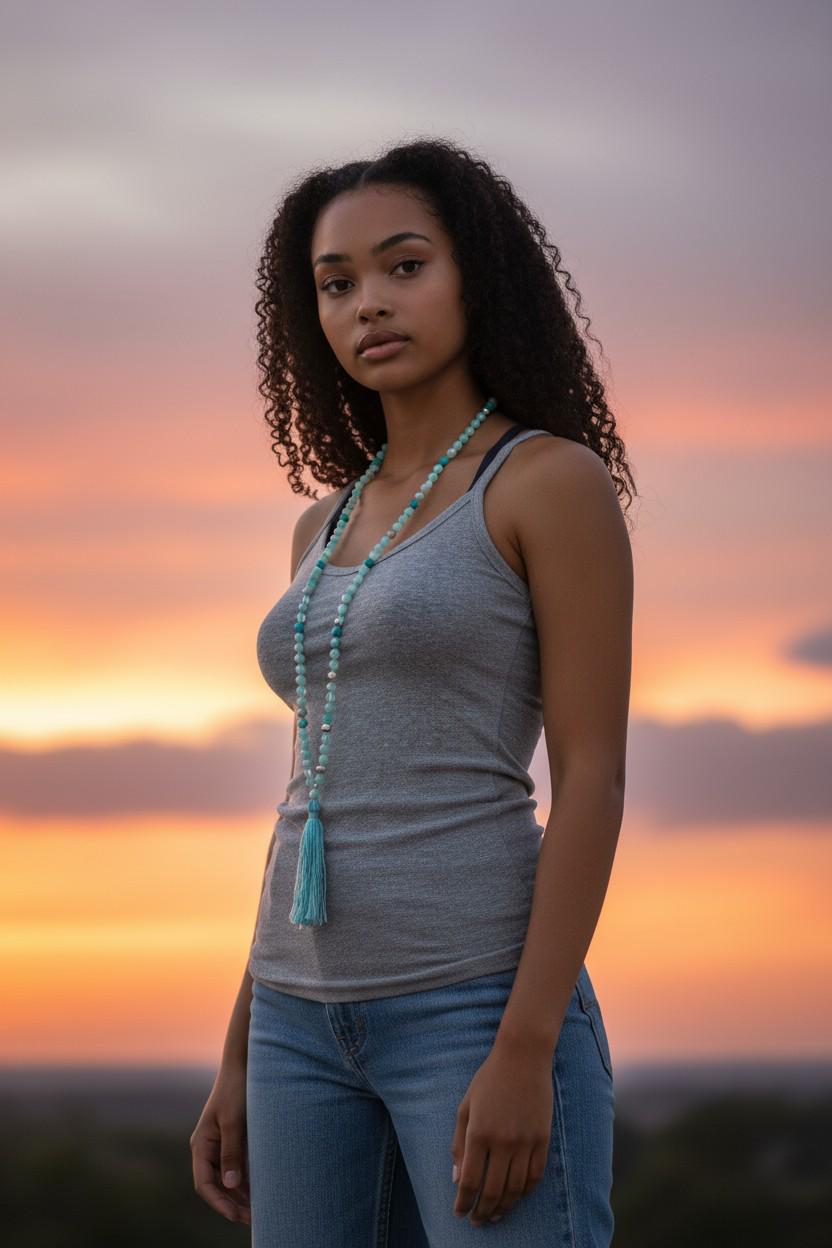 Expressive and soothing, this 108 bead Mala necklace is part of the Chakra-inspired collection and is hand-knotted from Amazonite, Aqua Terra Jasper, Agate, and Turquoise, finished with a soft sari silk tassel. These stones are often connected with the Throat Chakra—Amazonite with calm communication, Aqua Terra Jasper with peace, Agate with stability, and Turquoise with self-expression. Meaningful and versatile, this Mala is a beautiful choice for meditation, mindfulness, or as a unique jewelry piece. A variety of different tassel choices are available, you choose the look you like best.