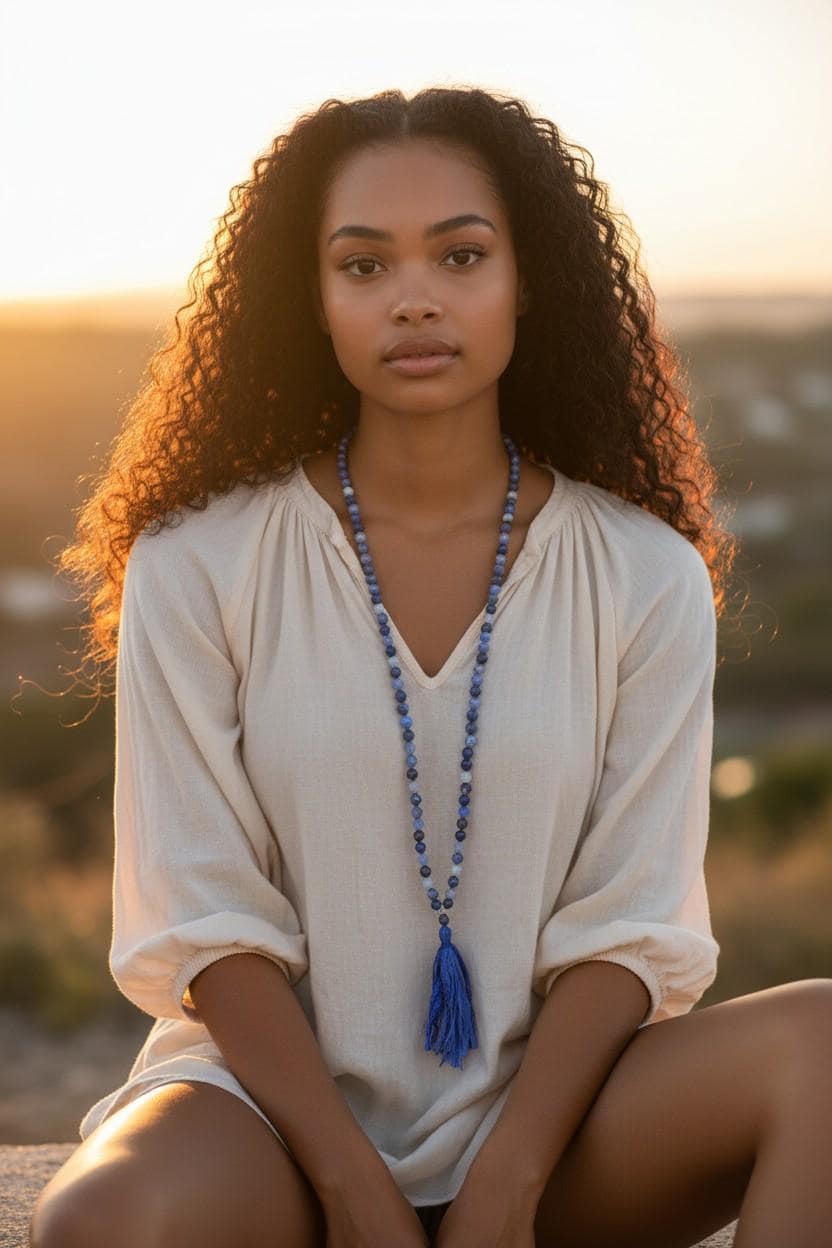 Intuitive and calming, this 108 bead Mala necklace is part of the Chakra-inspired collection and is hand-knotted from Sodalite, Lapis Lazuli, Blue Fire Agate, and Aquamarine, finished with a Sari silk tassel. These stones are often linked with the Third Eye Chakra—Sodalite with insight, Lapis Lazuli with wisdom, Blue Fire Agate with protection, and Aquamarine with clarity. Both meaningful and beautiful, this Mala is a thoughtful companion for meditation, mindfulness, or as a unique jewelry piece. A variety of different tassel choices are available, you choose the look you like best