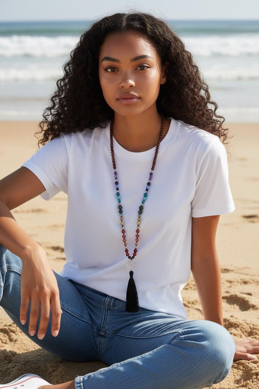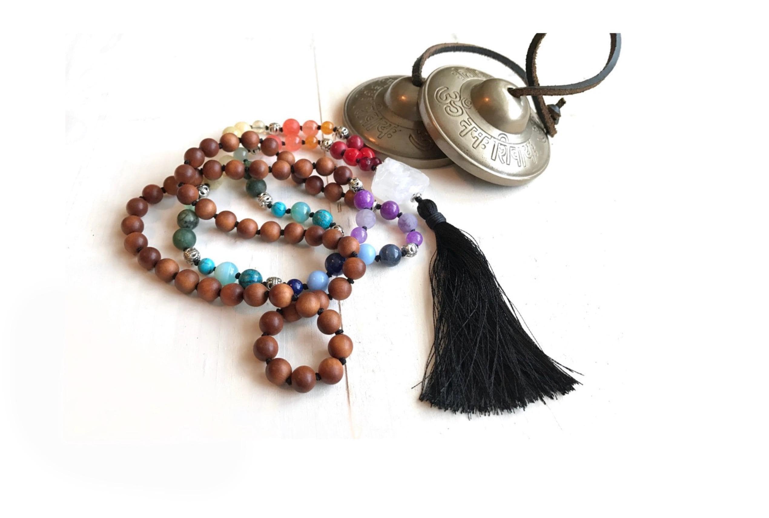 Seek inner peace with this Chakra Mala bead necklace from True Nature Jewelry. Custom designed to perfection, it features an impressive arrangement of a variety of mixed stones and fragrant Sandalwood creating all the colors of the Chakras. This Mala is hand knotted with a knot between each bead for both flexibility and beauty. A large raw Quartz Guru bead and silk tassel complete this design. A variety of different tassel choices are available, you choose the look you like best