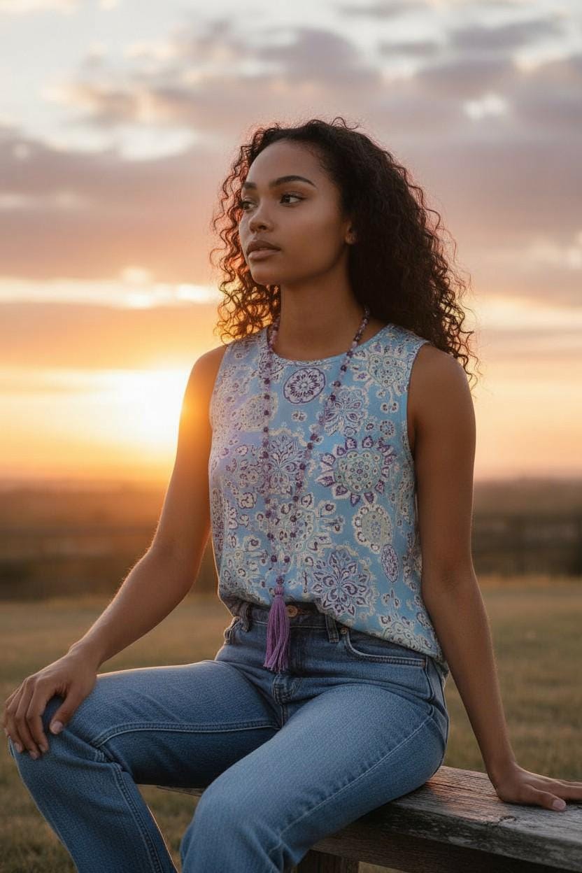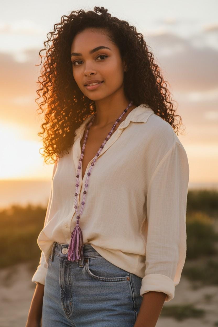 Spiritual and serene, this 108 bead Mala necklace is part of the Chakra-inspired collection and is hand-knotted from Jade, Amethyst, Lepidolite, Agate, and Fluorite, finished with a soft Sari silk tassel. These stones are often associated with the Crown Chakra—Jade with balance, Amethyst with spiritual awareness, Lepidolite with tranquility, Agate with stability, and Fluorite with clarity. Both meaningful and elegant, this Mala is a beautiful companion for meditation, mindfulness, or as a unique jewelry piece. A variety of different tassel choices are available, you choose the look you like best
