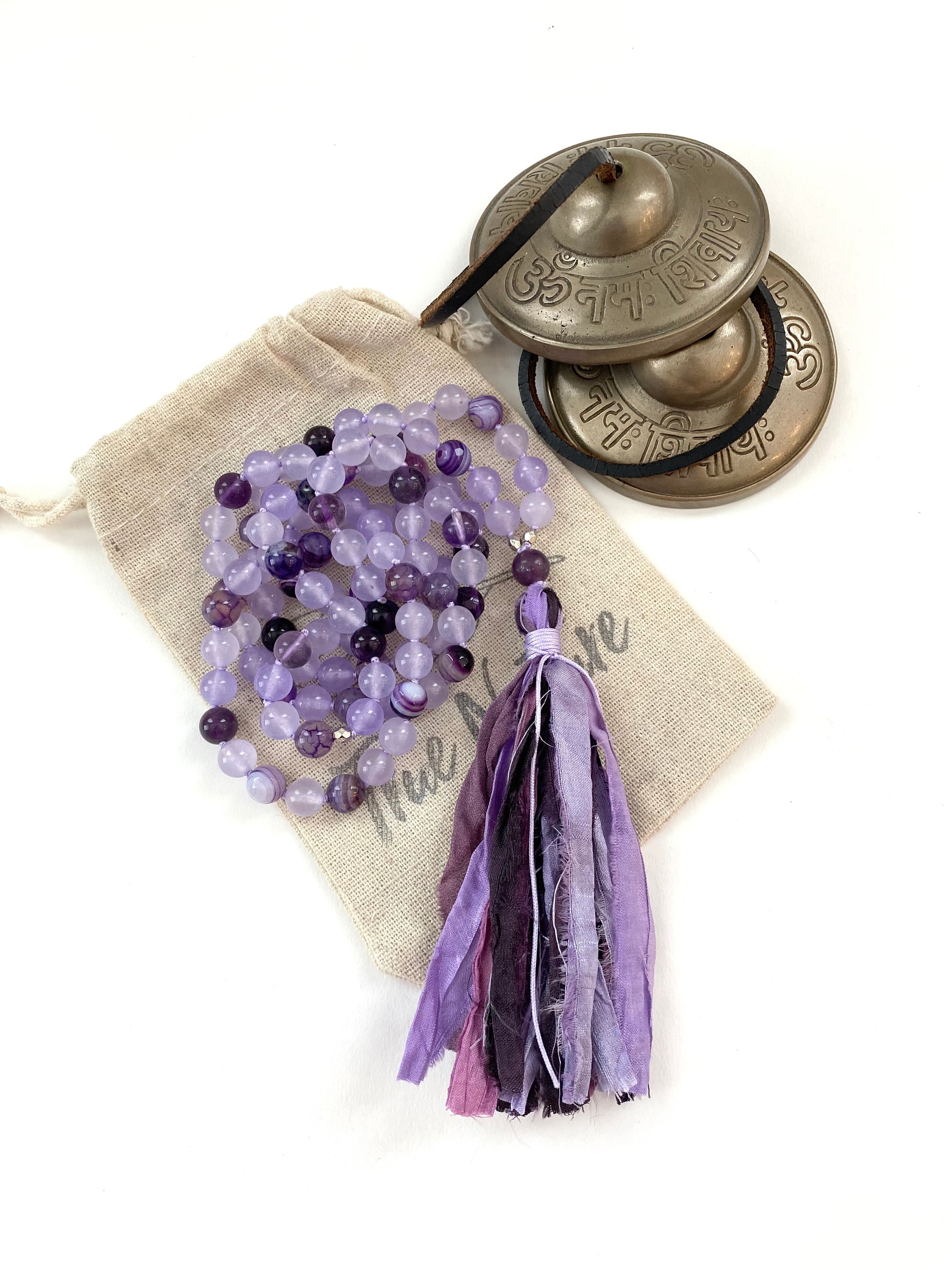 Spiritual and serene, this 108 bead Mala necklace is part of the Chakra-inspired collection and is hand-knotted from Jade, Amethyst, Lepidolite, Agate, and Fluorite, finished with a soft Sari silk tassel. These stones are often associated with the Crown Chakra—Jade with balance, Amethyst with spiritual awareness, Lepidolite with tranquility, Agate with stability, and Fluorite with clarity. Both meaningful and elegant, this Mala is a beautiful companion for meditation, mindfulness, or as a unique jewelry piece. A variety of different tassel choices are available, you choose the look you like best