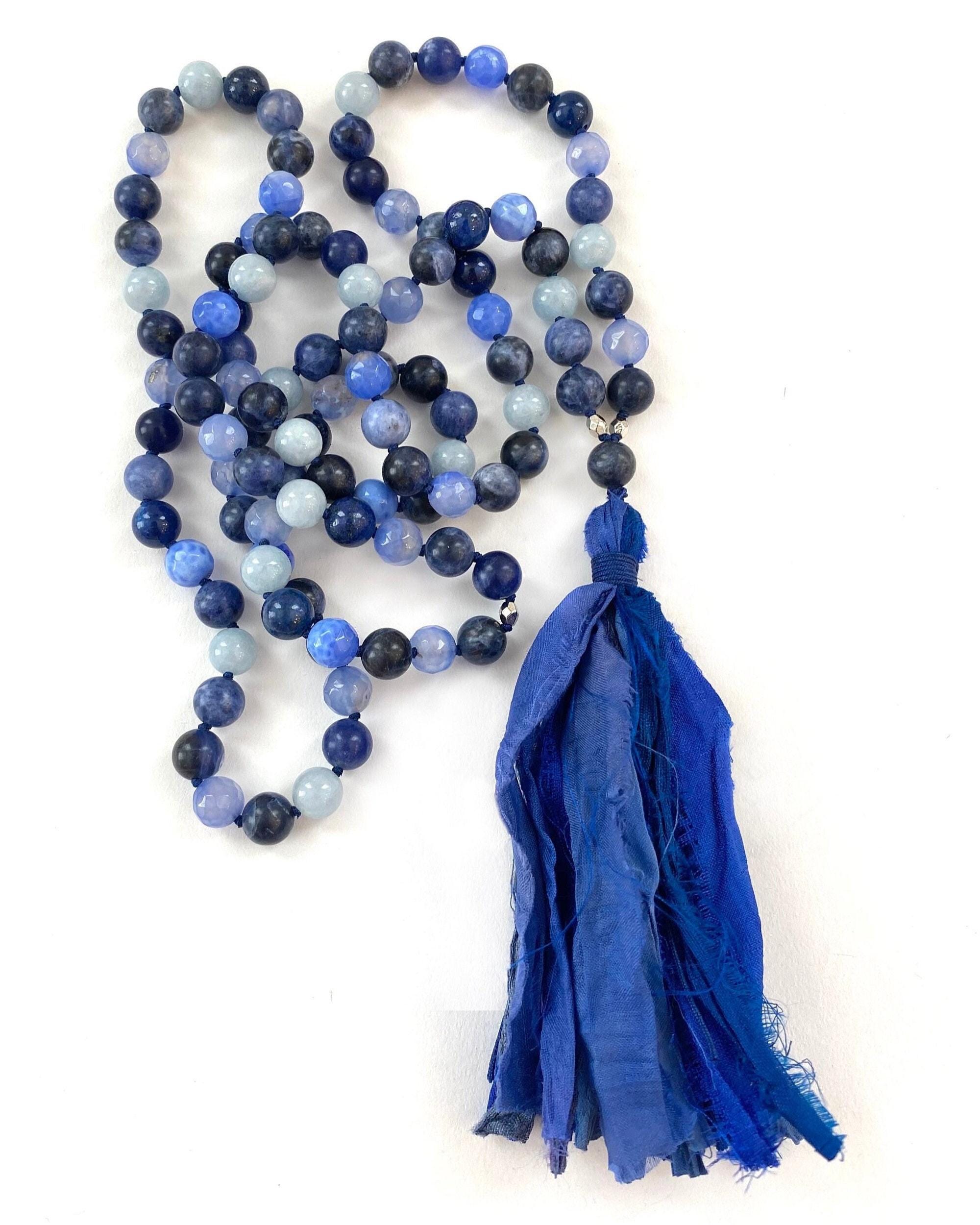 Intuitive and calming, this 108 bead Mala necklace is part of the Chakra-inspired collection and is hand-knotted from Sodalite, Lapis Lazuli, Blue Fire Agate, and Aquamarine, finished with a Sari silk tassel. These stones are often linked with the Third Eye Chakra—Sodalite with insight, Lapis Lazuli with wisdom, Blue Fire Agate with protection, and Aquamarine with clarity. Both meaningful and beautiful, this Mala is a thoughtful companion for meditation, mindfulness, or as a unique jewelry piece. A variety of different tassel choices are available, you choose the look you like best