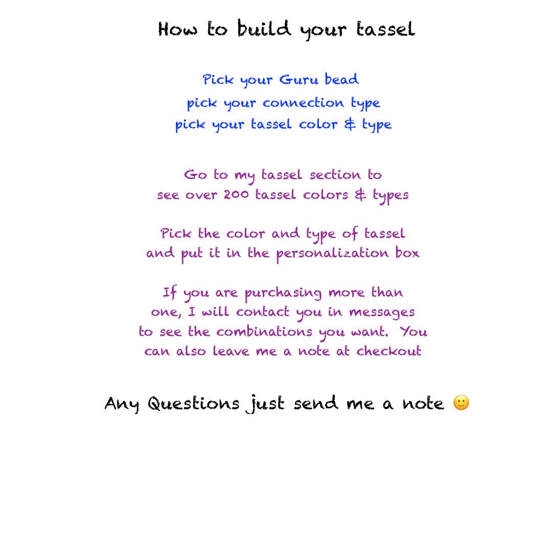 Build your own tassel just the way you want. These unique tassels are completely customizable. You design your tassel using your choice in a stone Guru bead, the connection type you need and the color choice and material of the tassel. There are endless combinations and possibilities of what can be done with these tassels. If you are making your own Mala beads this would be a nice option for the Guru bead and tassel especially if you do not have the tools to drill beads and make tassels