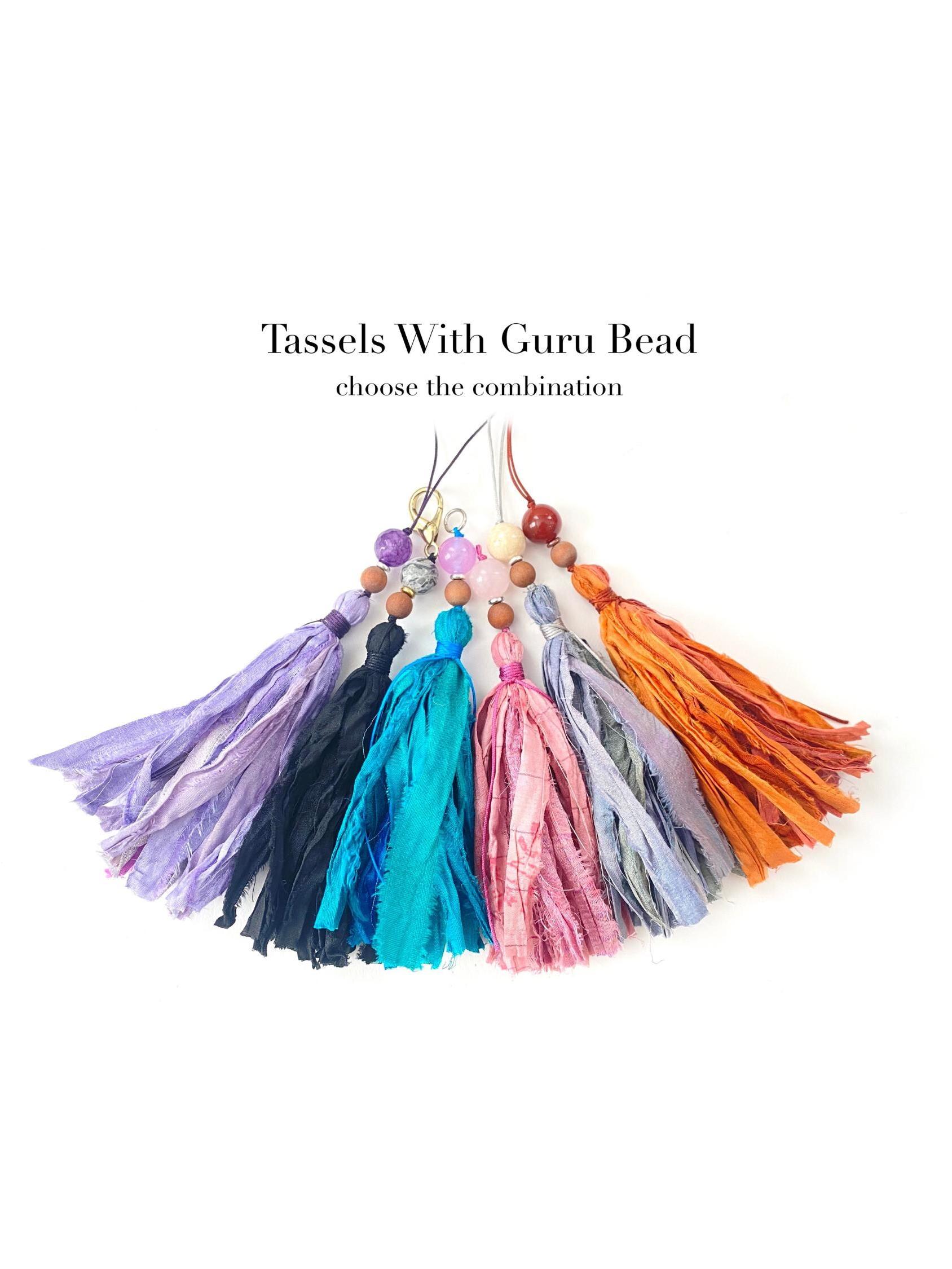 Build your own tassel just the way you want. These unique tassels are completely customizable. You design your tassel using your choice in a stone Guru bead, the connection type you need and the color choice and material of the tassel. There are endless combinations and possibilities of what can be done with these tassels. If you are making your own Mala beads this would be a nice option for the Guru bead and tassel especially if you do not have the tools to drill beads and make tassels