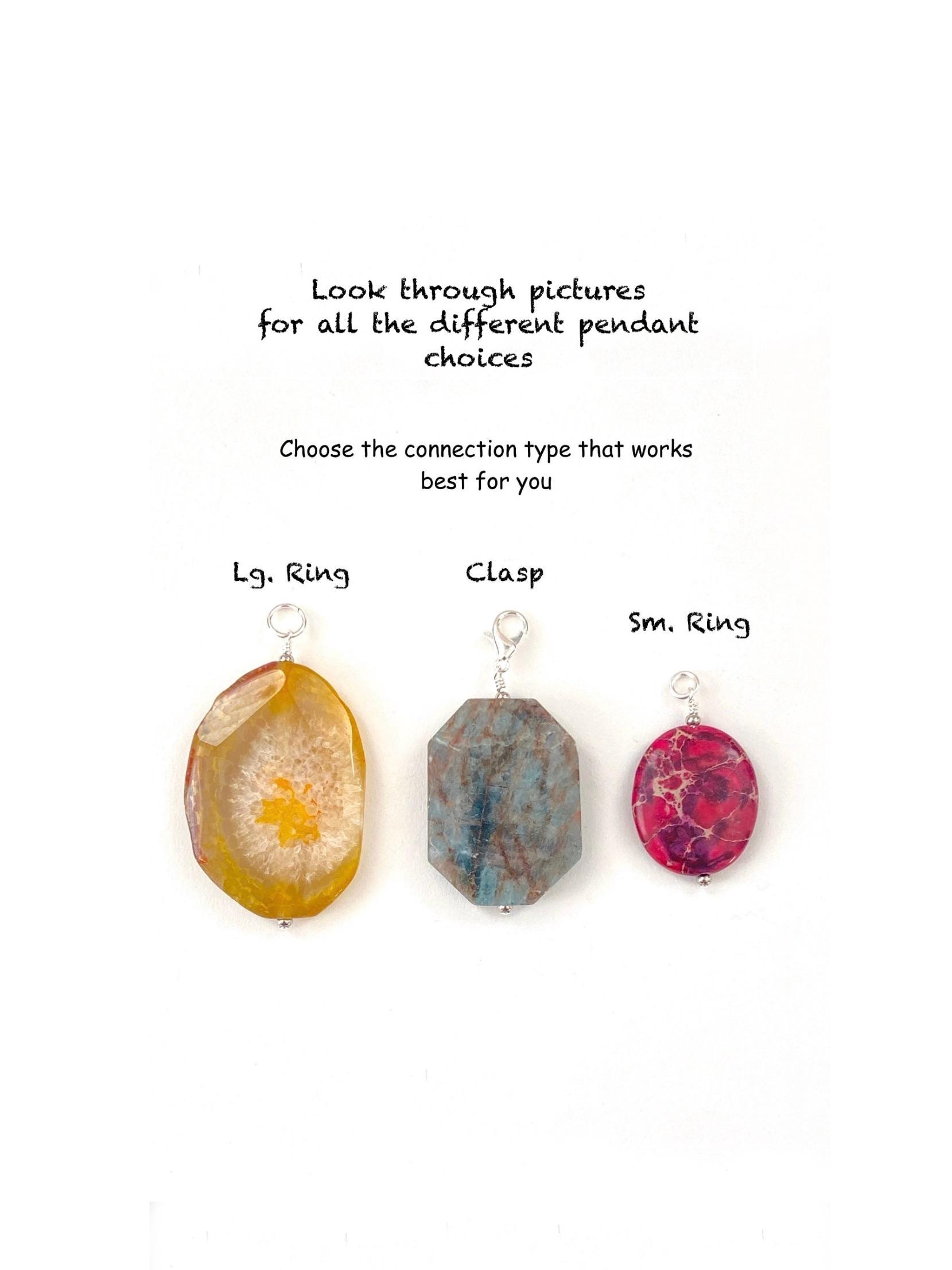Stone pendants ready to use for your Mala bead necklace. If you are making your own Mala or want to change a tassel Mala to a Mala with a stone pendant these are ready to go. I offer 3 different ways to connect the pendant to your Mala or project. I also offer the connectors in 6 different metal colors