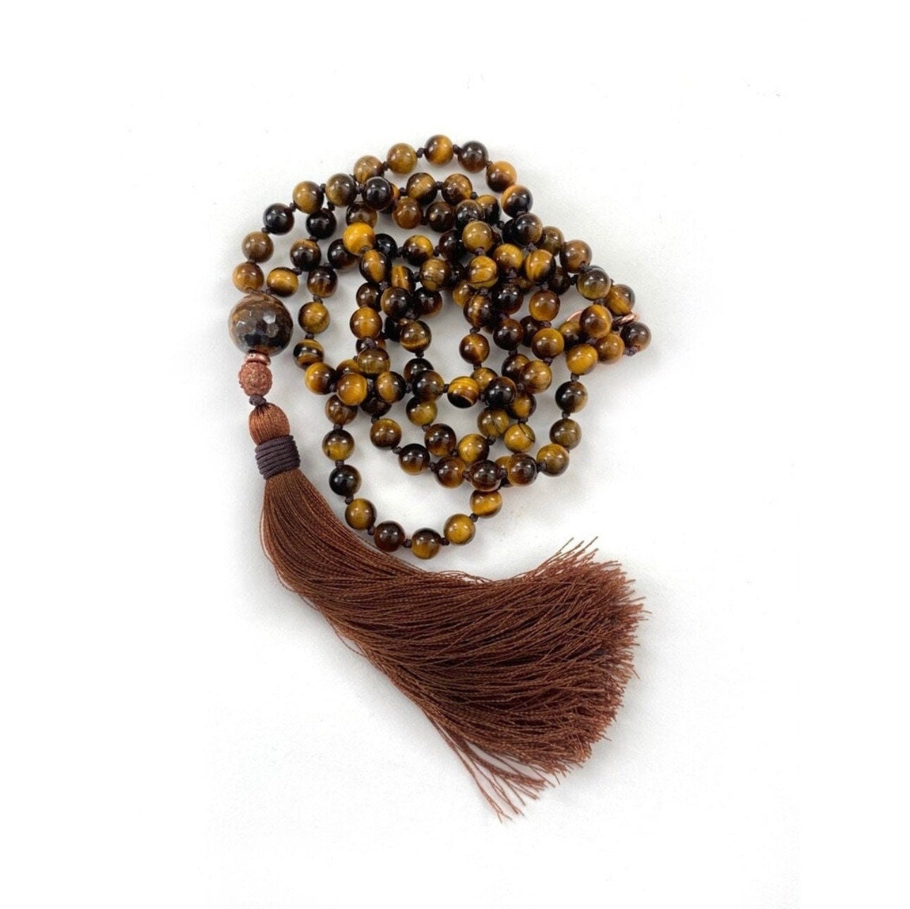 Rooted and powerful, this 108 bead Mala necklace is hand-knotted from Tiger Eye and Rudraksha, finished with a large faceted Tiger Eye guru bead and a soft silk thread tassel. These materials are often connected with strength and spiritual grounding—Tiger Eye is associated with focus, courage, and protection, while Rudraksha beads are traditionally valued for peace and spiritual connection. Unique and meaningful, this Mala is a beautiful choice for meditation and mindfulness. A variety of different tassels can be added, you choose the look you like best