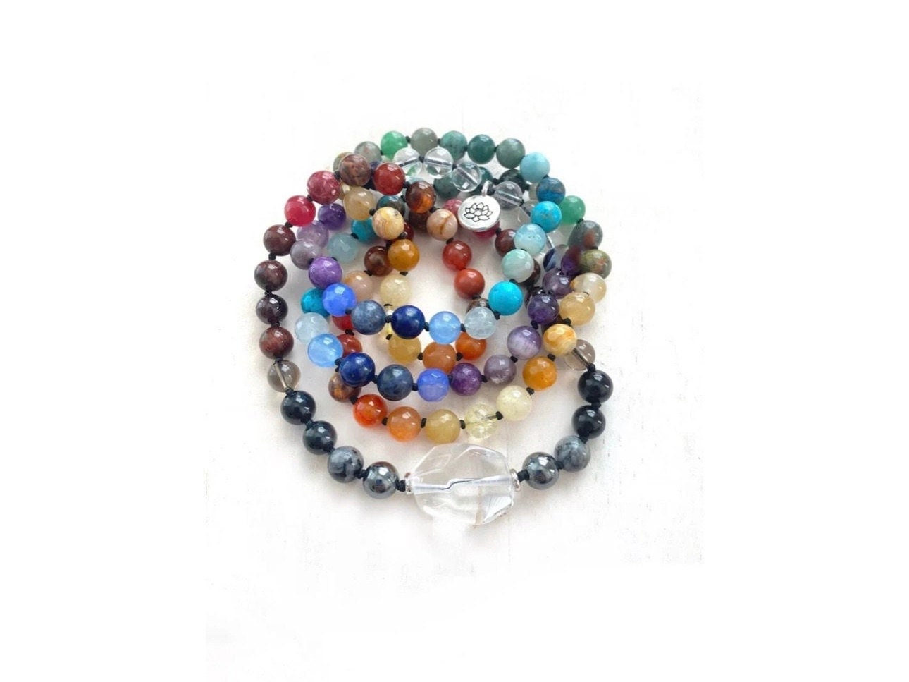 Unify, connect and balance the Charkas with this mixed gemstone Mala bead necklace. It is overflowing with a stunning collection of gemstones for every Chakra. The entire Mala is hand knotted for beauty and flexibility in your hand. The Guru bead is a large faceted Clear Quartz stone, this stone is known to be the most powerful of stones in the mineral kingdom and is often used to cleanse, open, activate, and align all of the Chakras. A variety of different tassel choices are available, you choose the look you like best