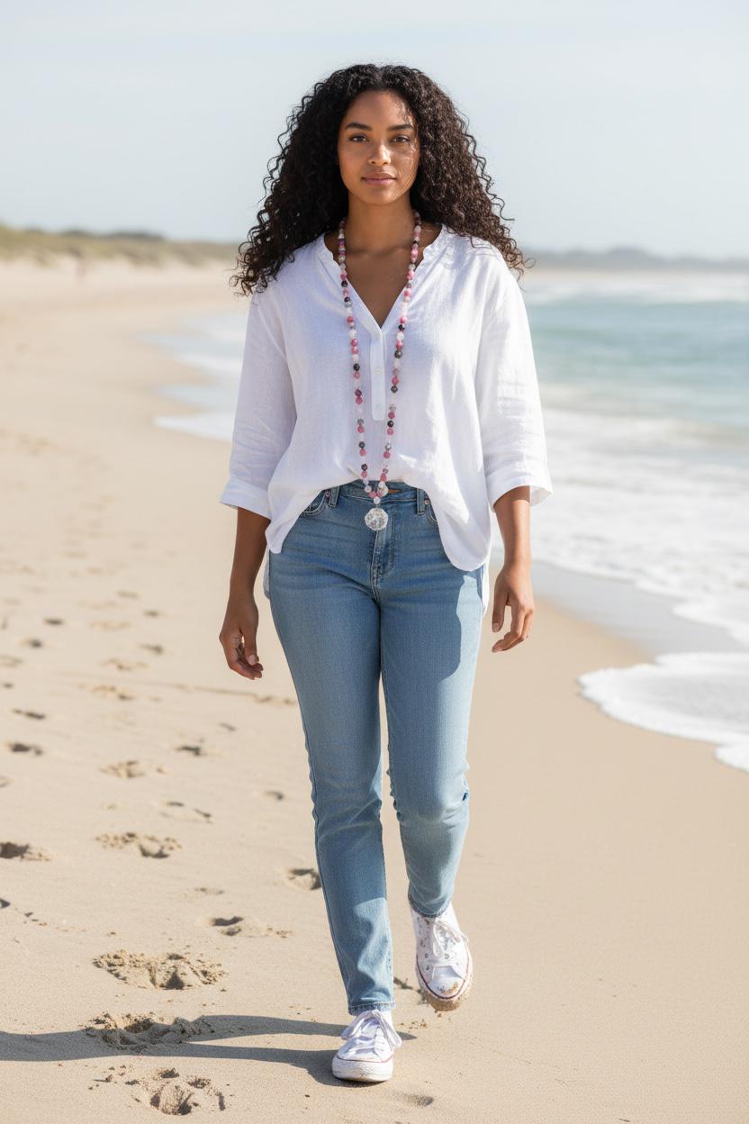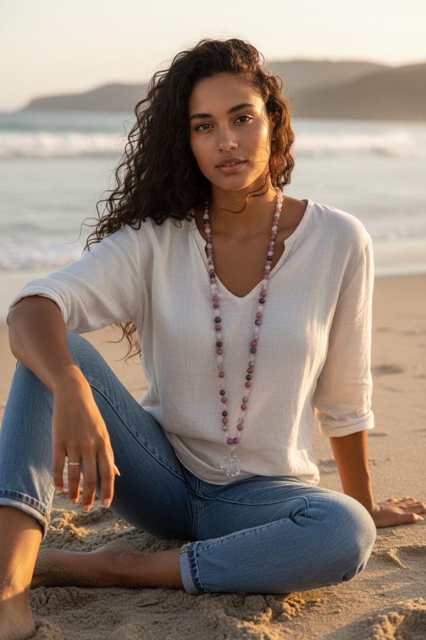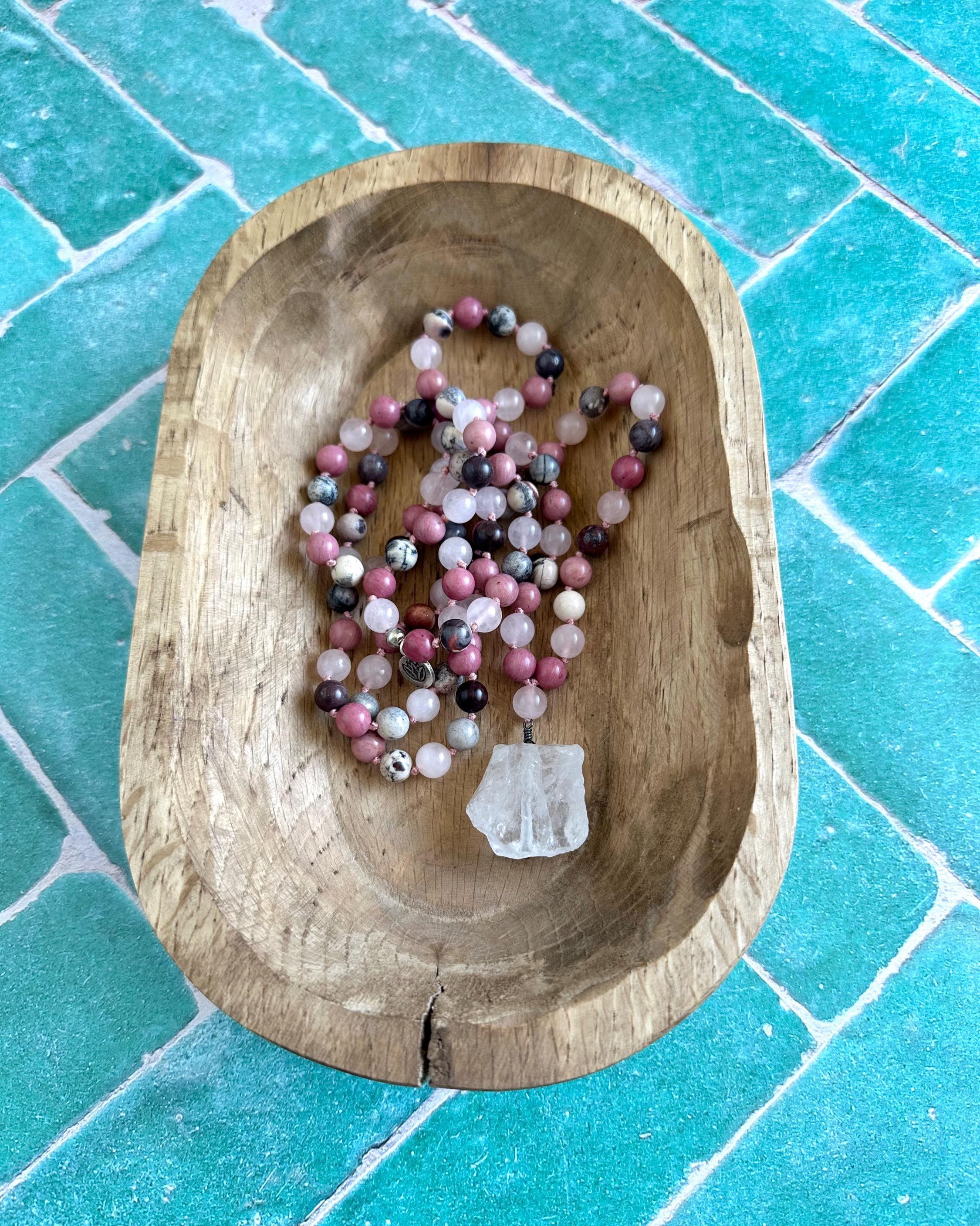Beautiful and unique, this 108 bead Mala is hand-knotted from Porcelain Jasper, Rose Quartz, and Rhodonite, finished with a large raw Clear Quartz bead that dangles from the end. A delicate lotus charm sits at the back of the mala, adding a meaningful touch. Porcelain Jasper is often connected with grounding and peace, Rose Quartz with love and compassion, Rhodonite with healing and balance, and Clear Quartz with clarity and energy. This Mala is both elegant and symbolic, making it a special choice for meditation, mindfulness, or as a special gift.