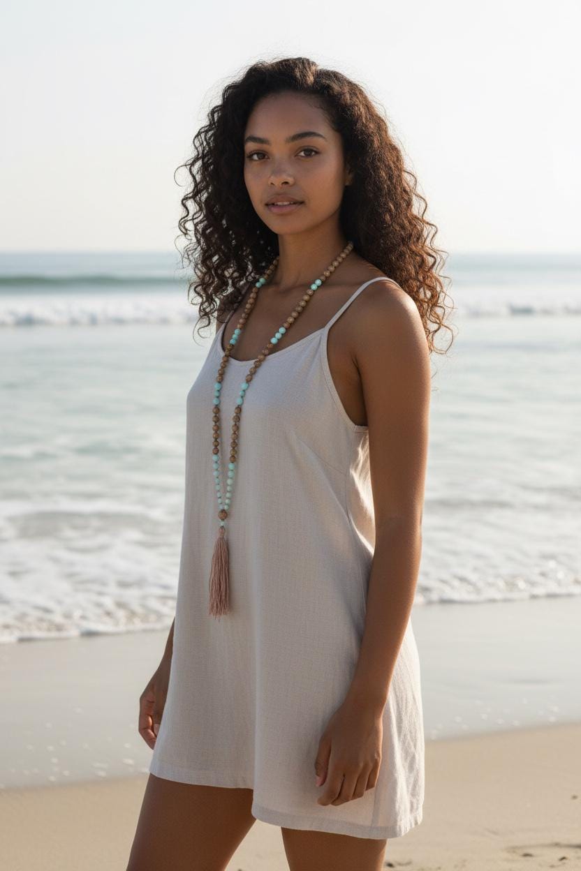 I personally design each Mala, carefully planning and laying out the bead design on a special bead board meant for 108 bead Mala’s. Every bead is hand-knotted by me for flexibility and beauty. I also create the tassels myself using Sari silk fabric, silk thread, cotton or other natural fibers. I can attach a pendant to any Mala if you choose not to have a tassel