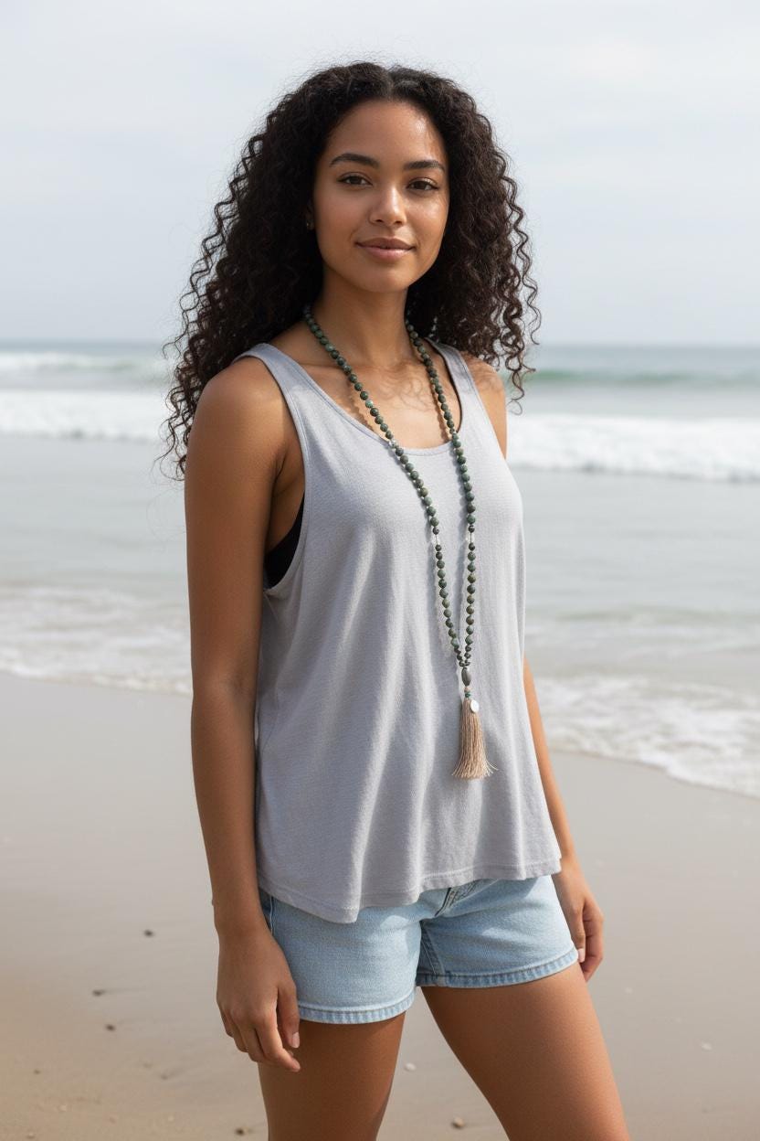 I personally design each Mala, carefully planning and laying out the bead design on a special bead board meant for 108 bead Mala’s. Every bead is hand-knotted by me for flexibility and beauty. I also create the tassels myself using Sari silk fabric, silk thread, cotton or other natural fibers. I can attach a pendant to any Mala if you choose not to have a tassel
