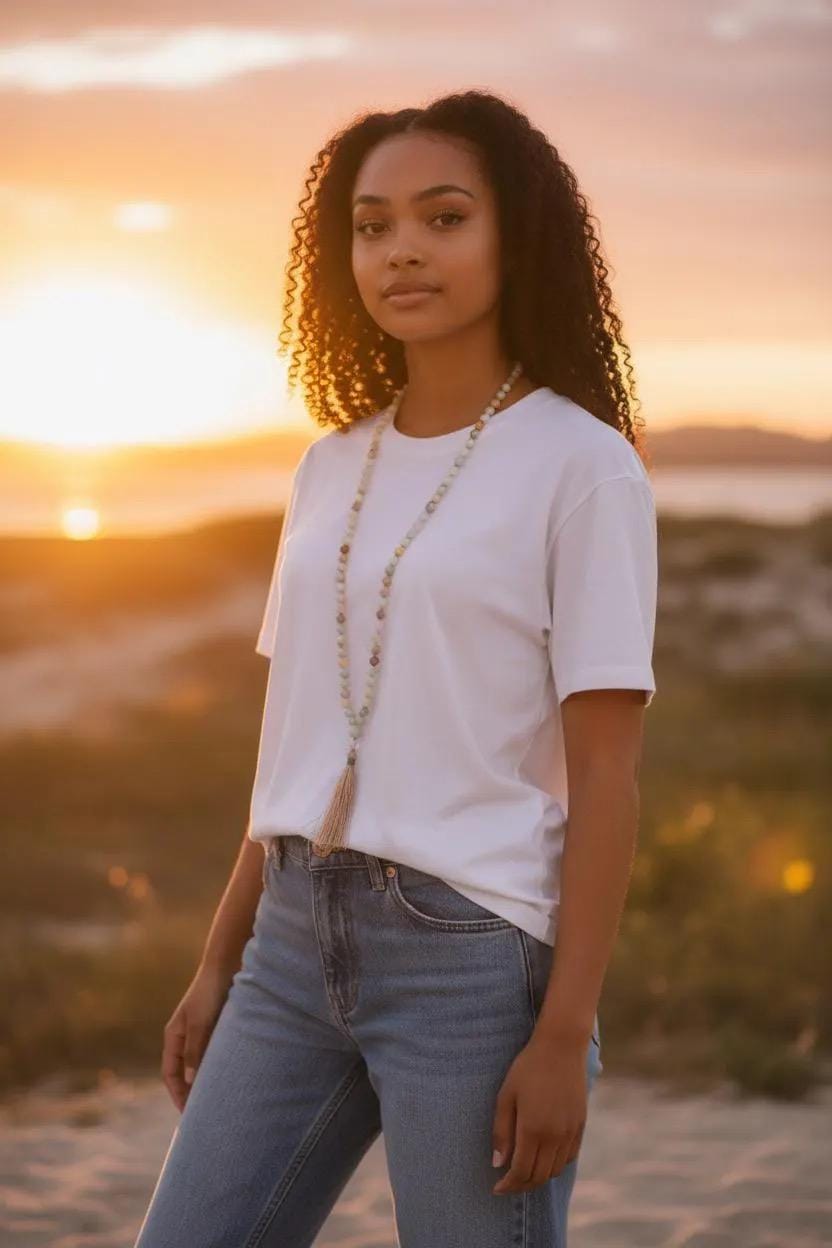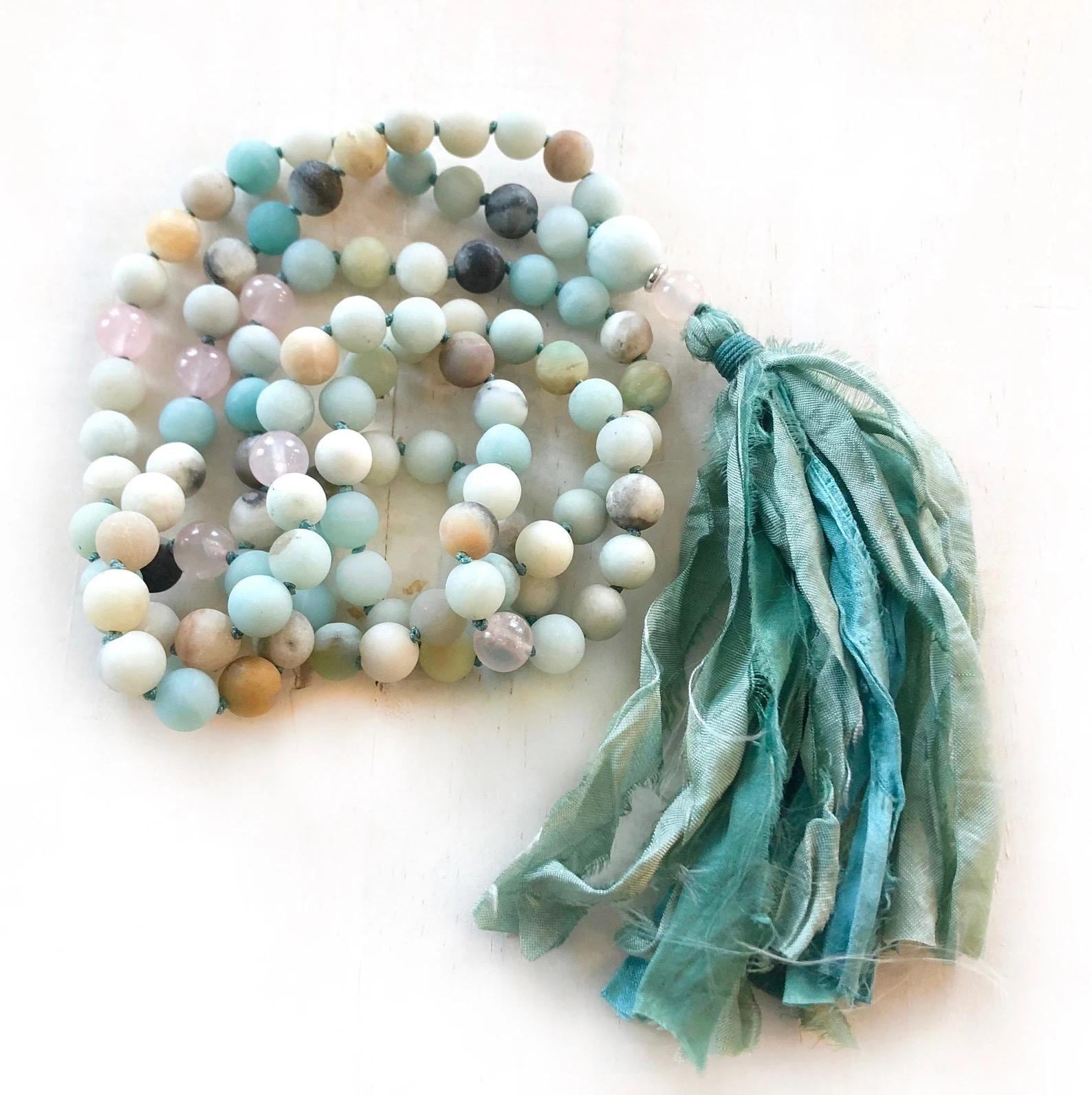 Colorful and uplifting, this 108 bead Mala necklace is hand-knotted from a mix of colorful Amazonite beads and Rose Quartz, finished with a large Amazonite Guru bead and a silk thread tassel, with other tassel choices available. This Mala can be made in either a polished or matte finish to suit your preference. These stones are often connected with harmony and love—Amazonite is associated with balance and soothing energy, while Rose Quartz is linked with compassion and the heart. Versatile and meaningful, this Mala is a beautiful choice for your meditation practice or giving as a gift