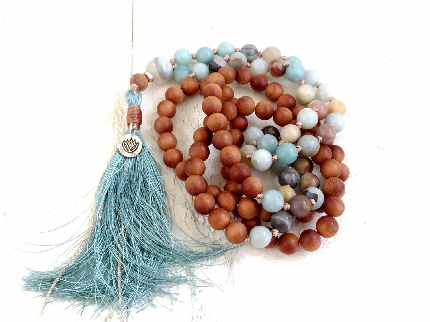 Calming and uplifting, this 108 bead Mala is hand-knotted from Sandalwood and Amazonite, finished with a large round Amazonite Guru bead. A Turquoise silk thread tassel with a Lotus charm completes the design, with a variety of other tassel options available for you to choose from. Amazonite is often connected with harmony and truth, while Sandalwood is linked with grounding and spiritual awareness. Together, they create a soothing and meaningful Mala, perfect for meditation, mindfulness, or as a gift for someone special.