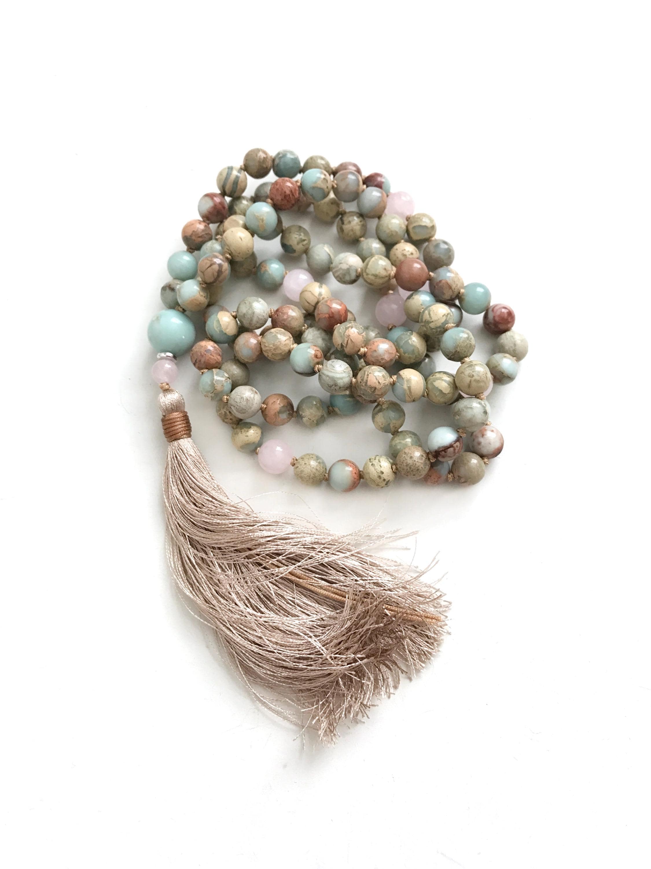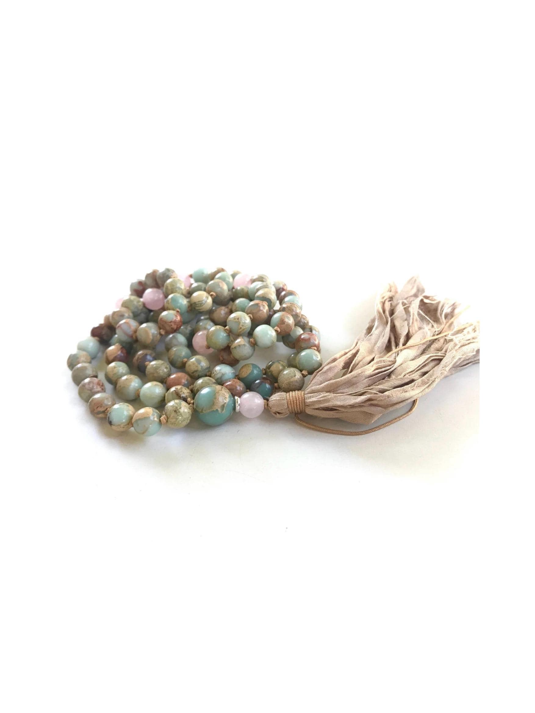 Calming and heartfelt, this 108 bead Mala necklace is hand-knotted from African Opal Jasper and Rose Quartz, finished with a soft Sari silk tassel. These stones are often connected with balance and compassion—African Opal Jasper is associated with soothing energy and grounding, while Rose Quartz is known as the stone of love and emotional healing. Elegant and meaningful, this Mala is a beautiful companion for meditation and mindfulness. A variety of different tassel choices are available, you choose the look you like best