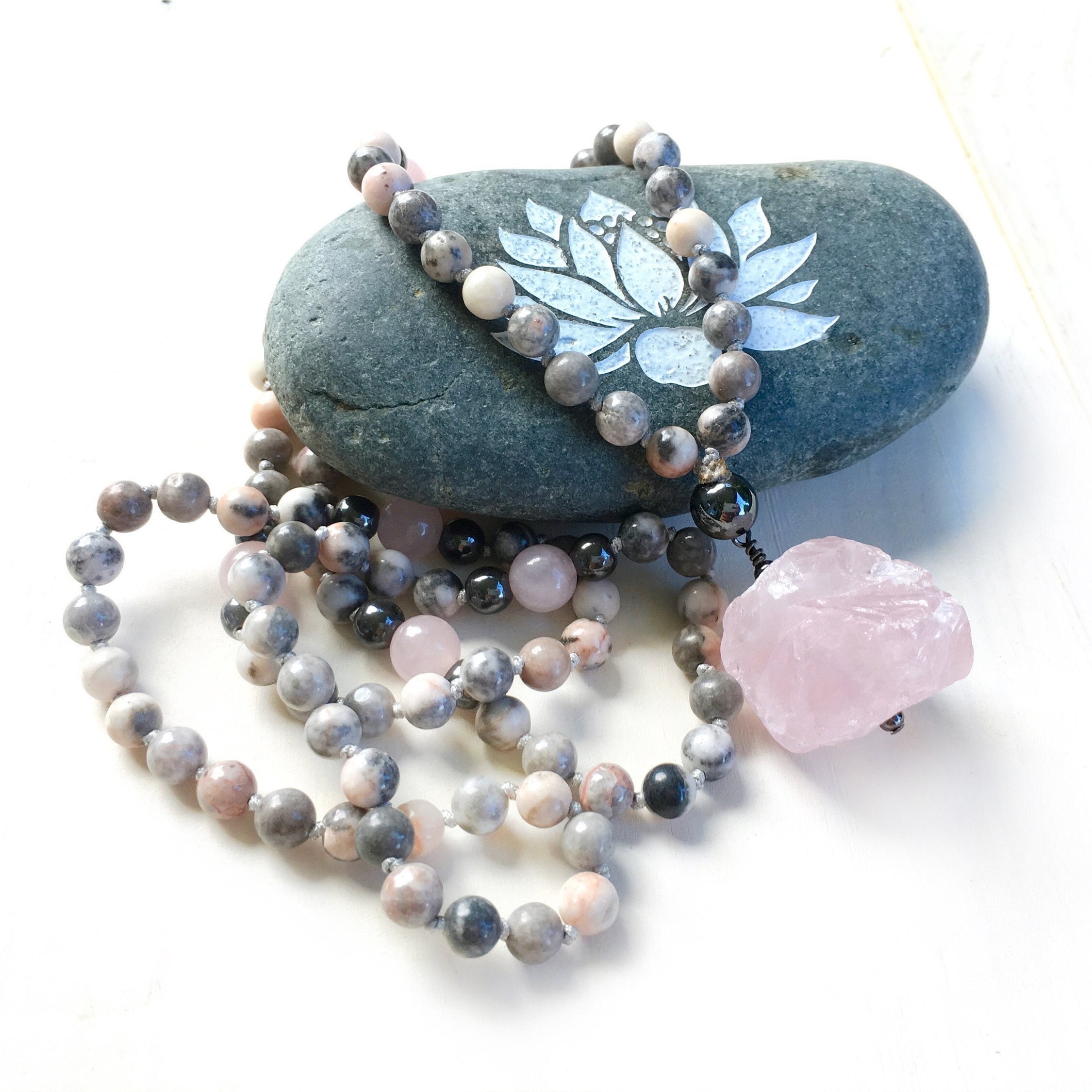 Colorful and expressive, this 108 bead Mala is hand-knotted from Pink Zebra Jasper, Hematite, and Rose Quartz, finished with a large raw Rose Quartz Guru bead. Pink Zebra Jasper is often connected with balance and stability, Hematite with grounding and protection, and Rose Quartz with love and compassion. This blend of stones makes the Mala both vibrant and meaningful, perfect for meditation, mindfulness, or as a unique gift idea.