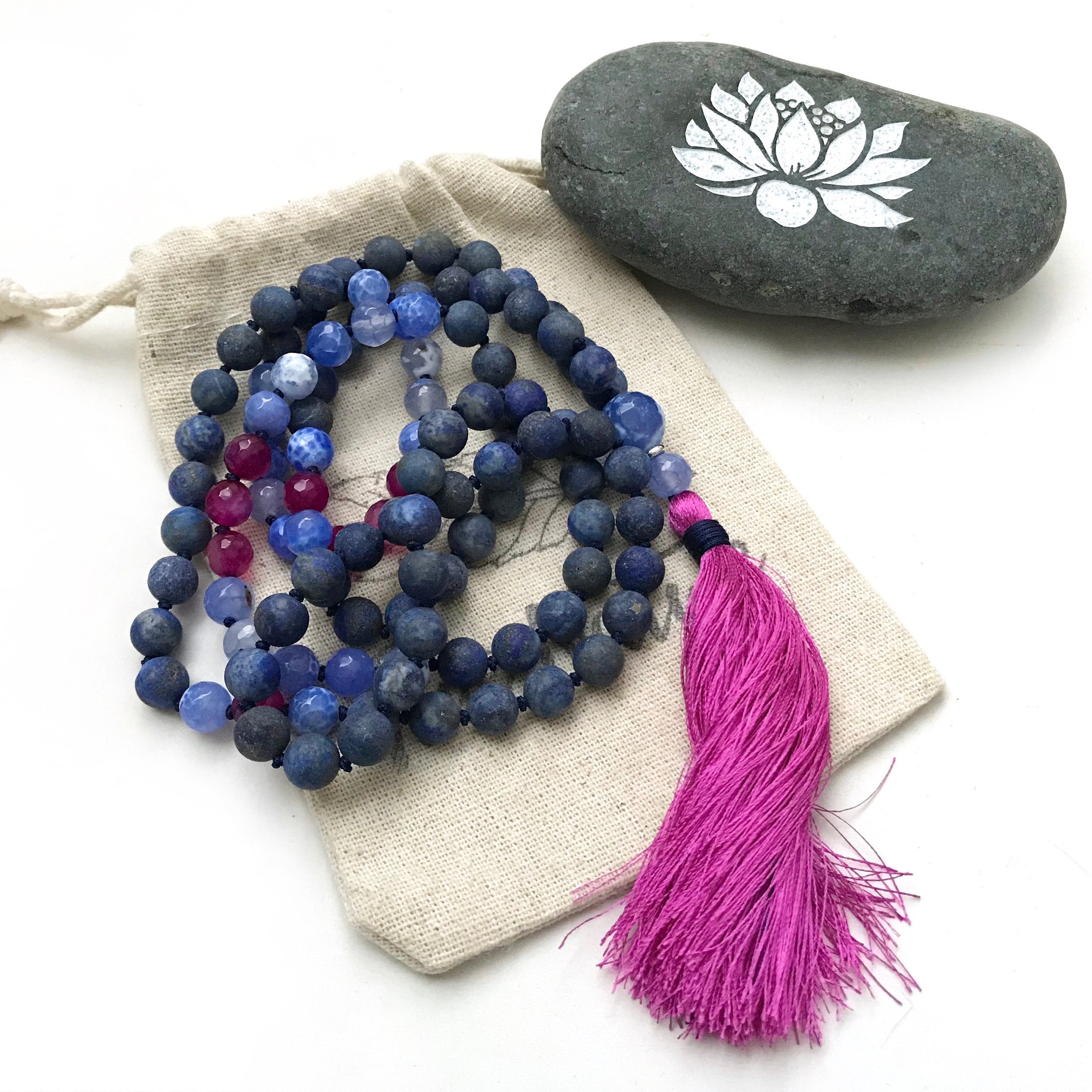 Vibrant and full of contrast, this 108 bead Mala necklace is hand-knotted from matte Lapis Lazuli, faceted Rose Agate, and faceted Blue Fire Agate, finished with a large faceted Blue Fire Agate Guru bead and a bright Pink silk thread tassel. These stones are often connected with strength and energy—Lapis Lazuli is associated with wisdom and truth, Rose Agate with warmth and vitality, and Blue Fire Agate with protection and focus. Bold and distinctive, this Mala is a meaningful choice for meditation, mindfulness, or as a unique jewelry piece. You get to choose the type of tassel you want on your Mala