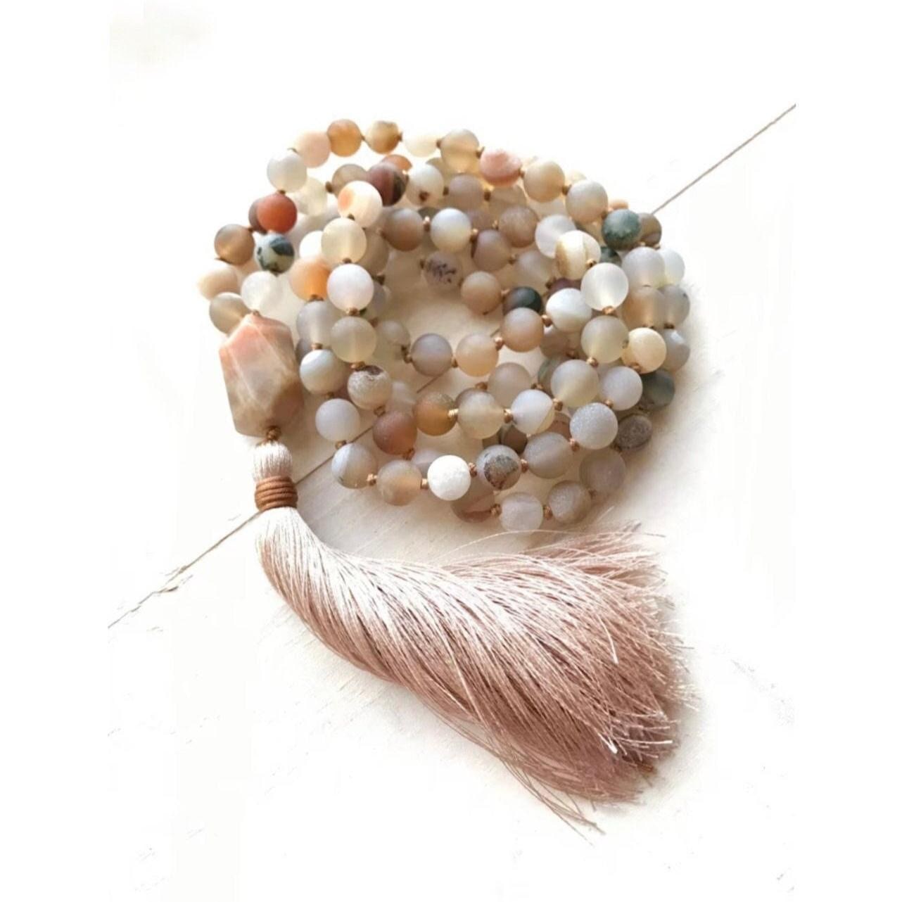Radiant and grounding, this 108 bead Mala necklace is hand-knotted from Druzy Agate and finished with a large faceted Sunstone Guru bead and a soft silk thread tassel. These stones are often connected with balance and vitality—Druzy Agate is associated with harmony and inner strength, while Sunstone is linked with joy, energy, and optimism. Both striking and meaningful, this Mala is a beautiful companion for meditation and mindfulness, or as a unique gift. A variety of different tassel choices are available, you choose the look you like best