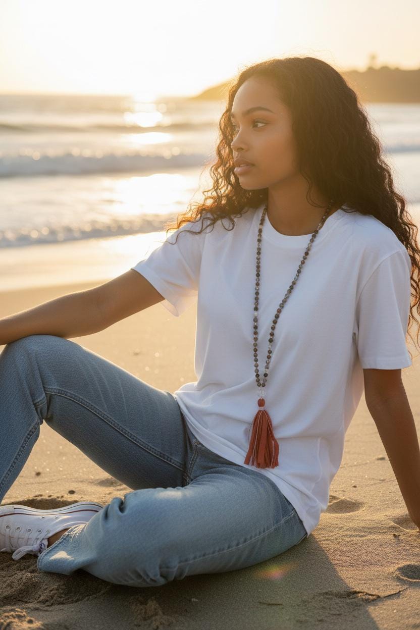 I personally design each Mala, carefully planning and laying out the bead design on a special bead board meant for 108 bead Mala’s. Every bead is hand-knotted by me for flexibility and beauty. I also create the tassels myself using Sari silk fabric, silk thread, cotton or other natural fibers. I can attach a pendant to any Mala if you choose not to have a tassel