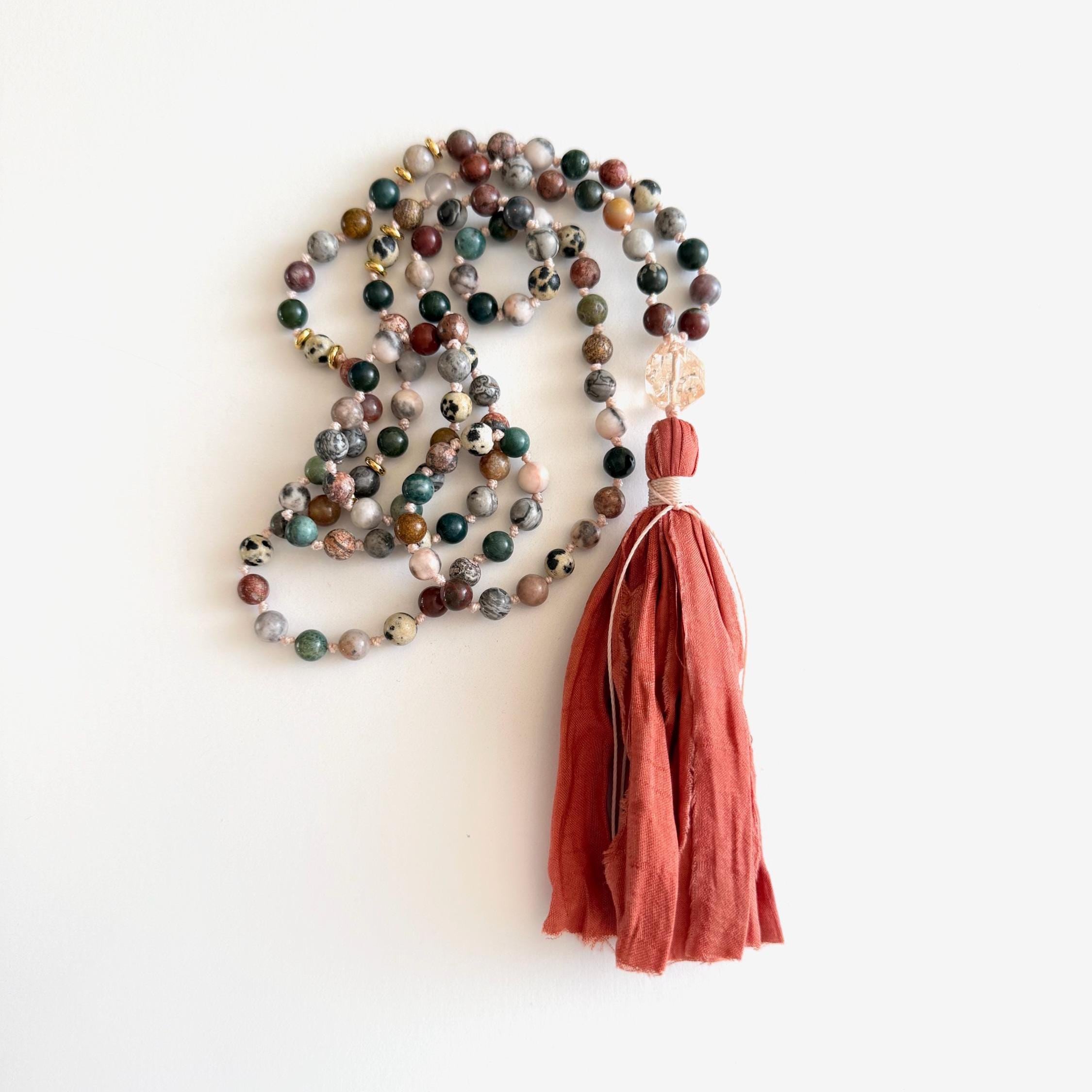 Handmade with care, this 108 bead mala necklace is crafted from a mix of natural Jasper stones, each one hand-knotted for strength, beauty, and ease of movement during meditation. Jasper is often associated with grounding and stability, making this mala a meaningful companion for mindfulness, yoga, or daily wear. A faceted Quartz Guru bead and soft Sari silk tassel complete the design, adding a unique artisan touch. A variety of different tassel choices are available, you choose the look you like best