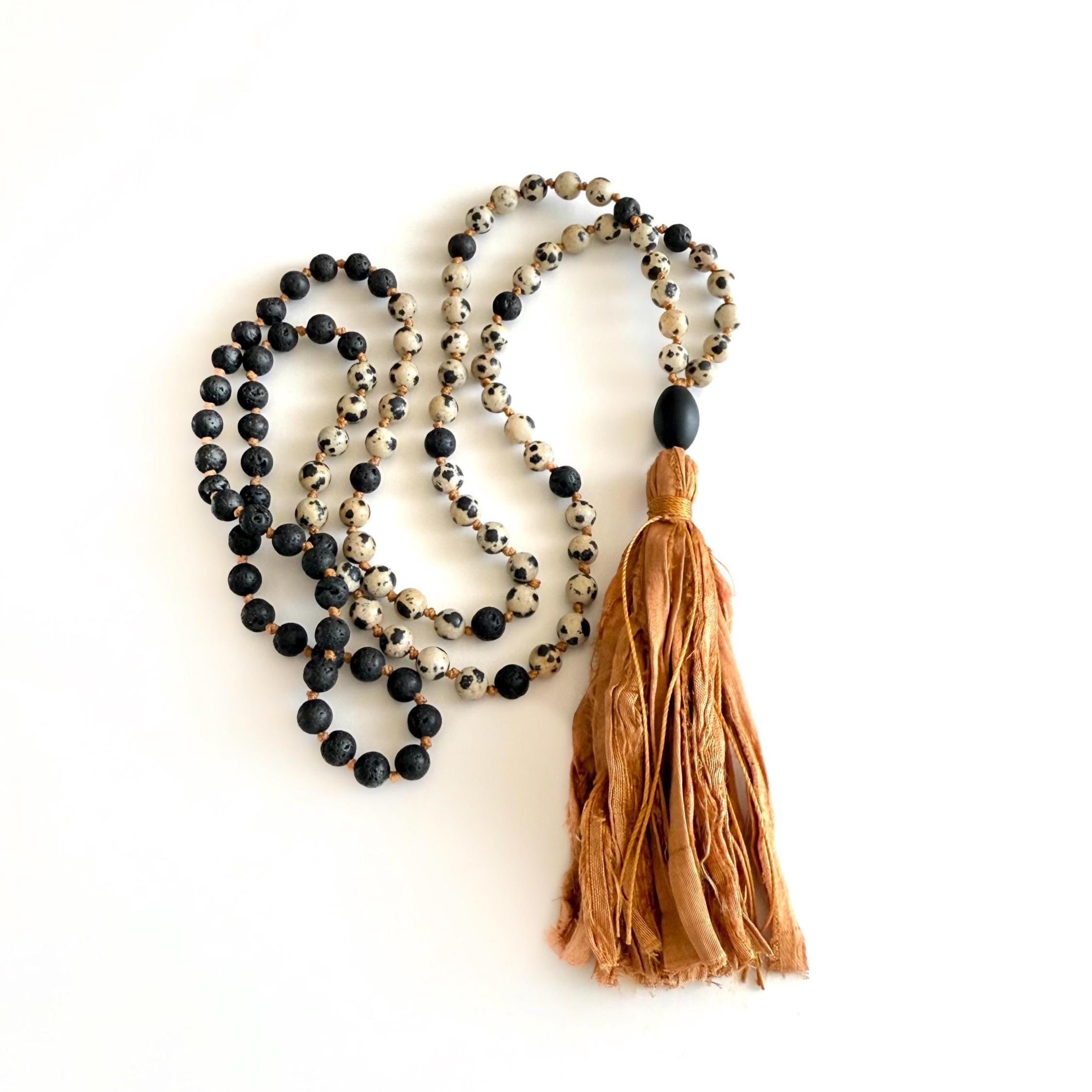 Natural and earthy, this 108 bead Mala necklace is hand-knotted from Black Lava and Dalmatian Jasper, finished with a Black Onyx Guru bead and a soft sari silk tassel. These stones are often connected with grounding and protection—Lava is associated with strength and stability, Dalmatian Jasper with joy and balance, and Onyx with focus and resilience. With its beautiful natural color palette, this Mala is a meaningful choice for meditation, mindfulness, or a wonderful gift for someone special. A variety of different tassel choices are available, you choose the look you like best