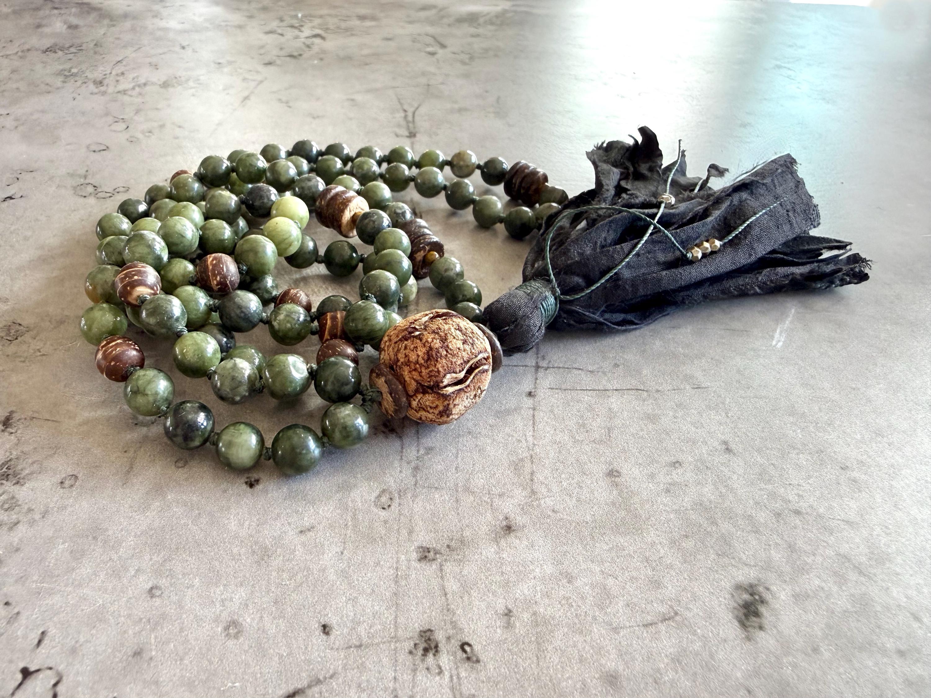 I personally design each Mala, carefully planning and laying out the bead design on a special bead board meant for 108 bead Mala’s. Every bead is hand-knotted by me for flexibility and beauty. I also create the tassels myself using Sari silk fabric, silk thread, cotton or other natural fibers. I can attach a pendant to any Mala if you choose not to have a tassel