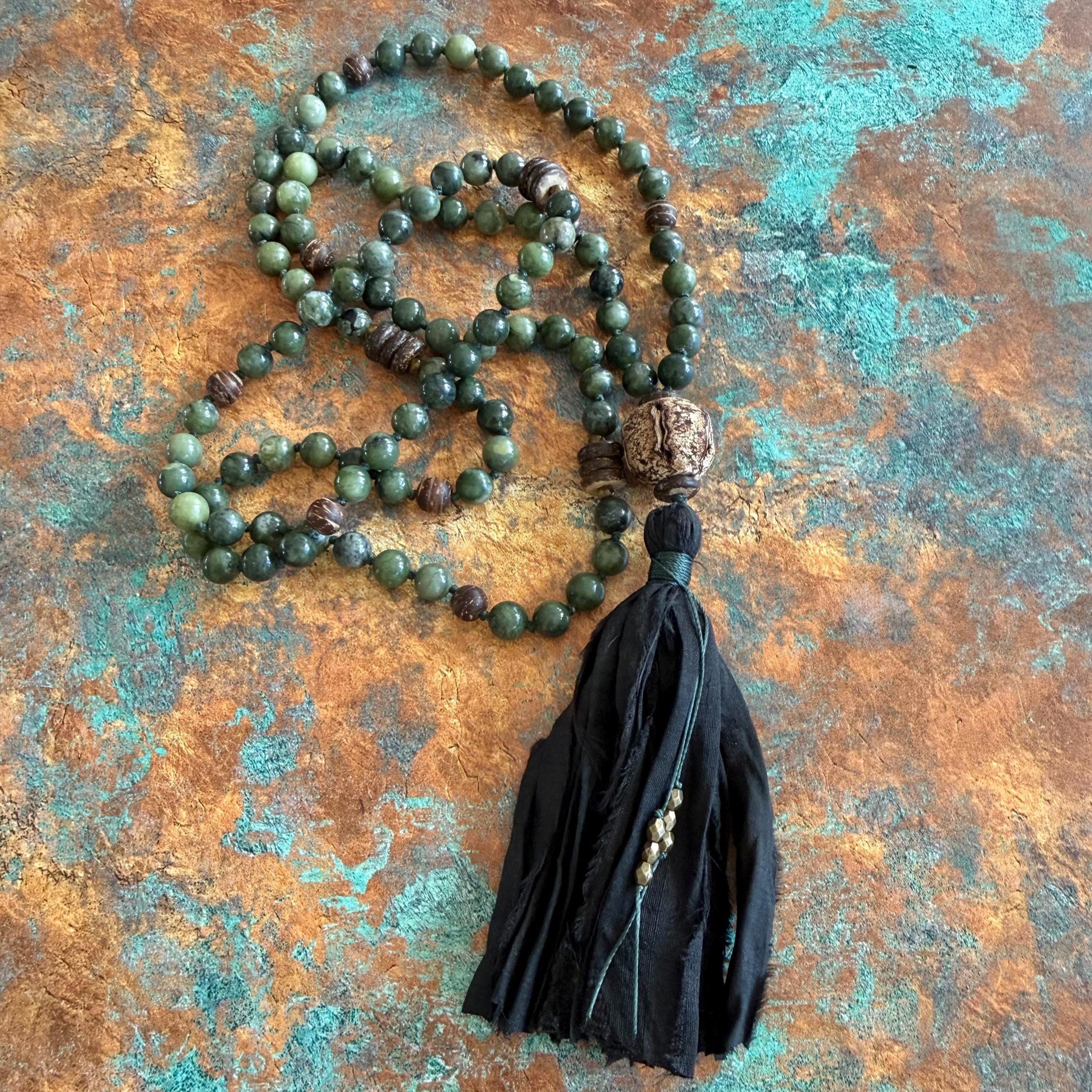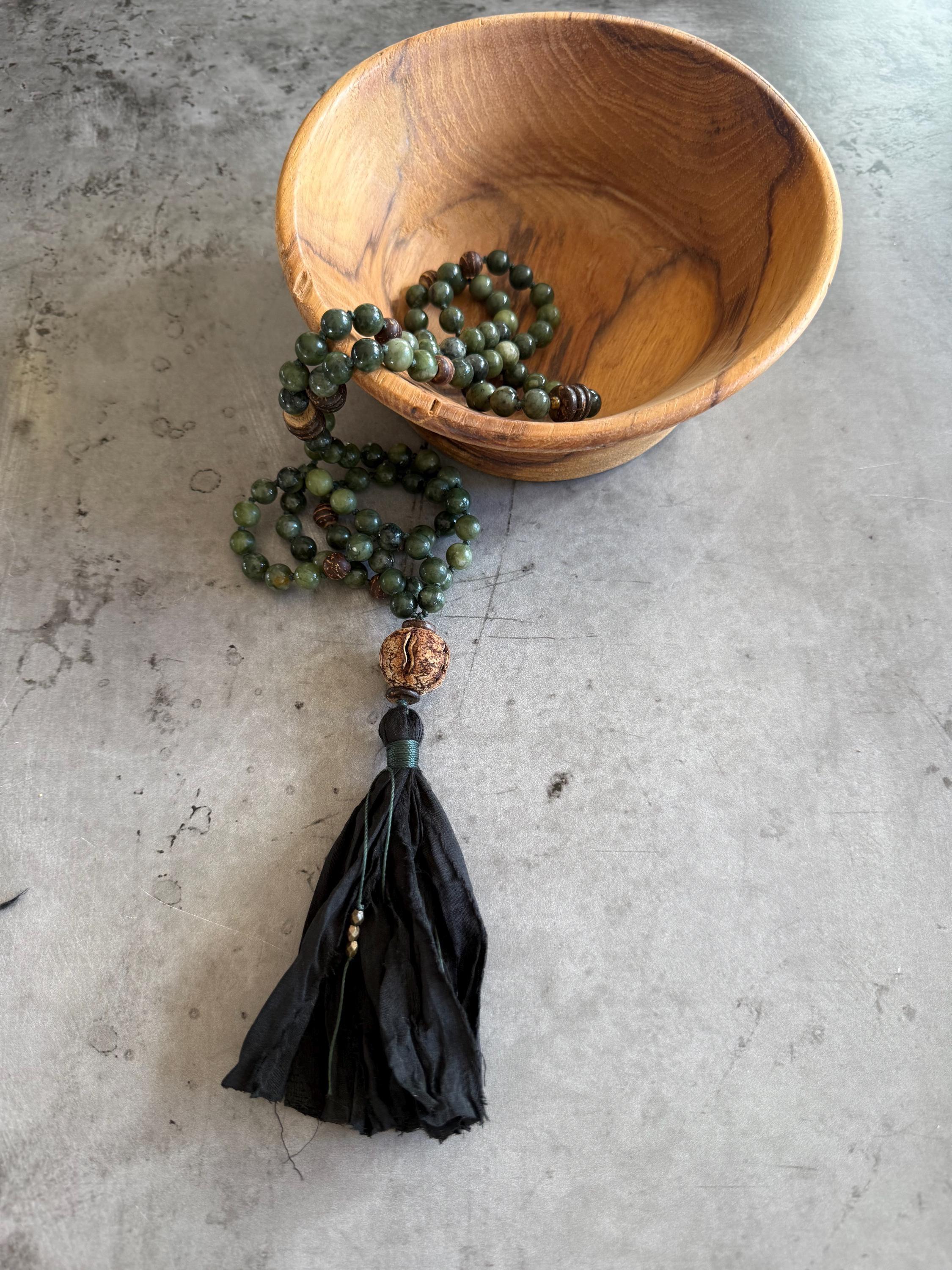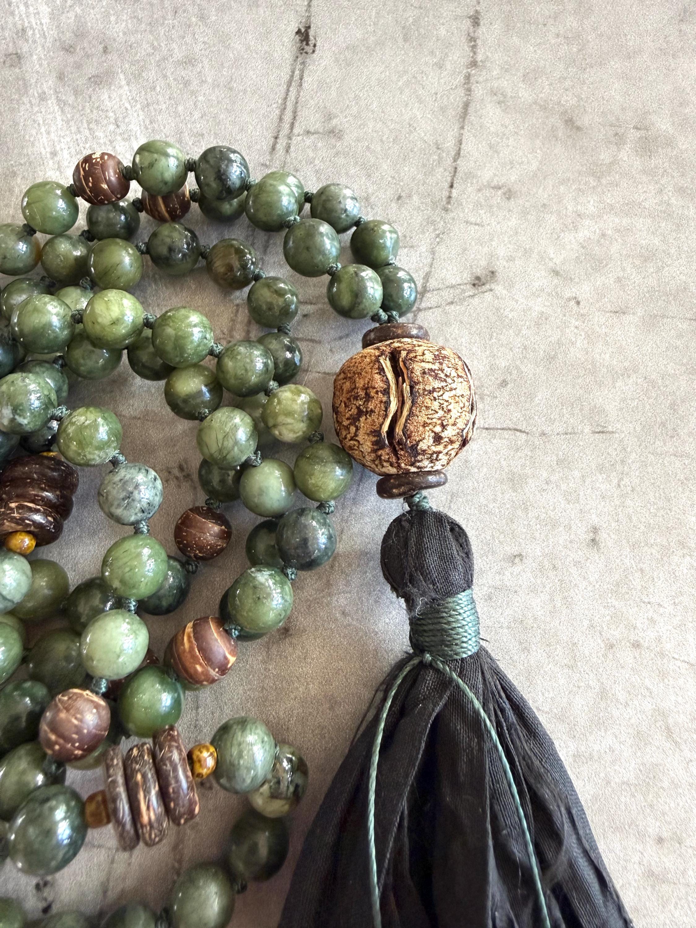 Grounded and elegant, this unisex 108 bead Mala is hand-knotted with Green jade and natural coconut shell beads, featuring a large Mahogany seed bead as the Guru bead. Marker beads are placed every 27 beads, creating a smooth flow for meditation, prayer, or daily wear. The Mala is finished with a black sari silk tassel and decorative string tie with tiny metal beads, adding a touch of refined craftsmanship.