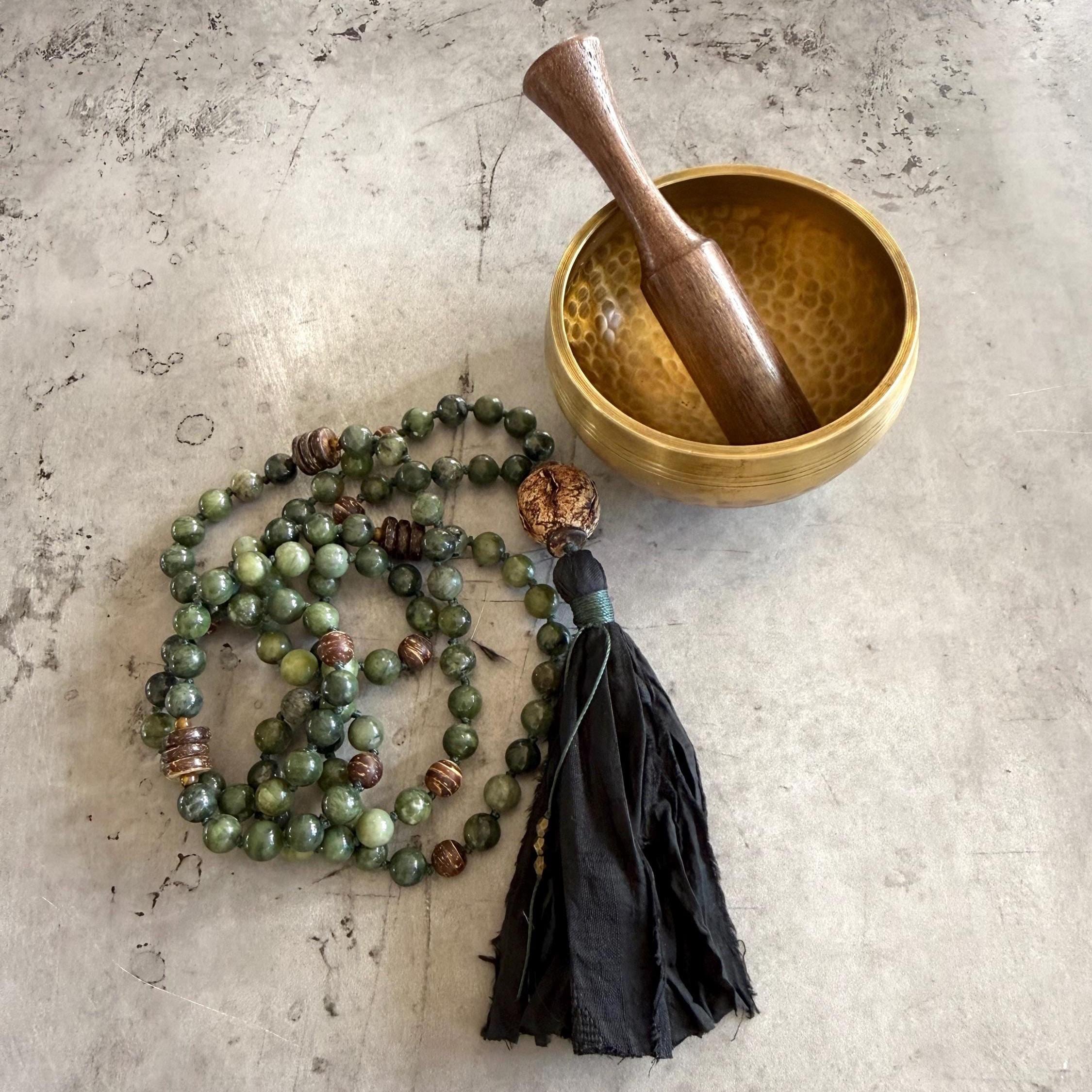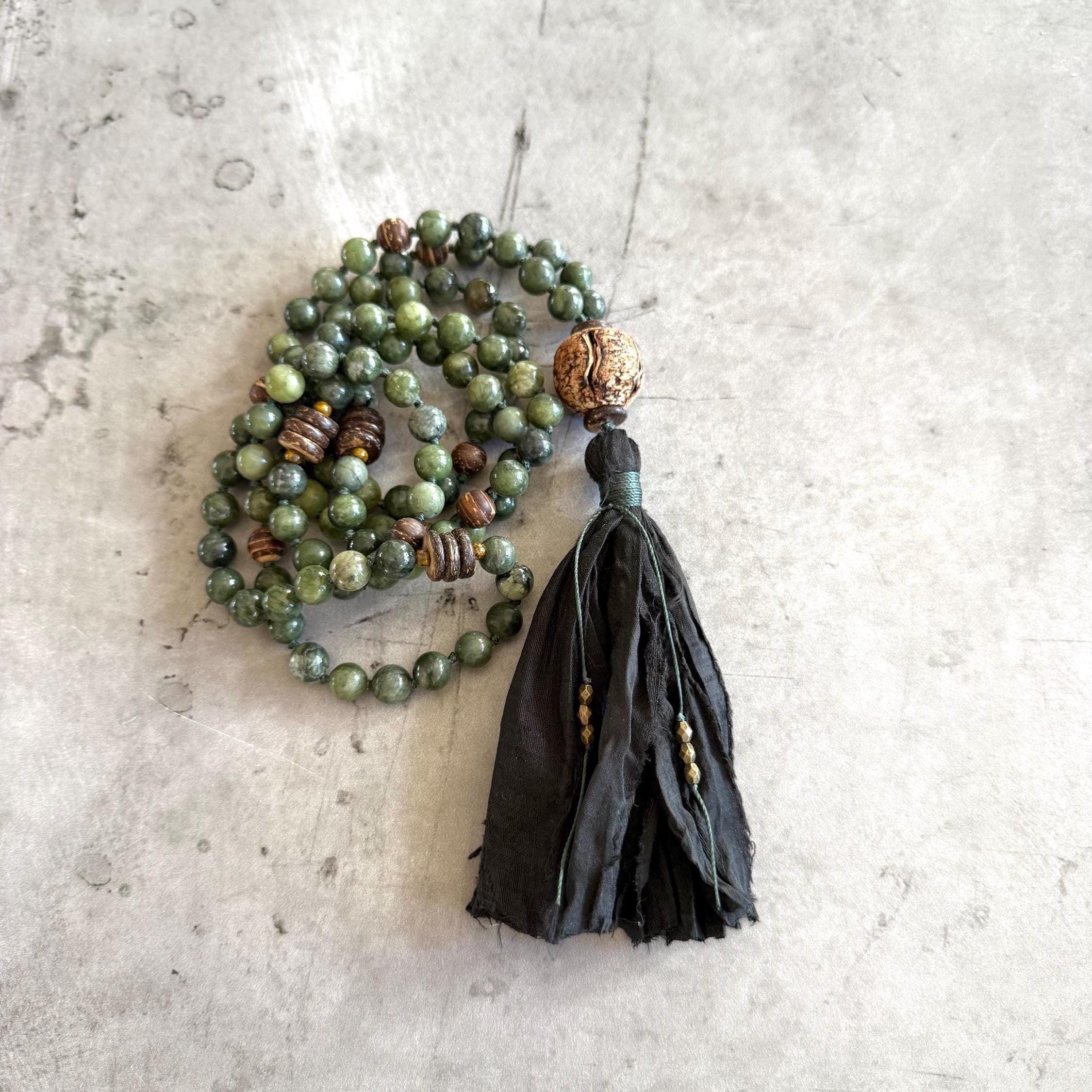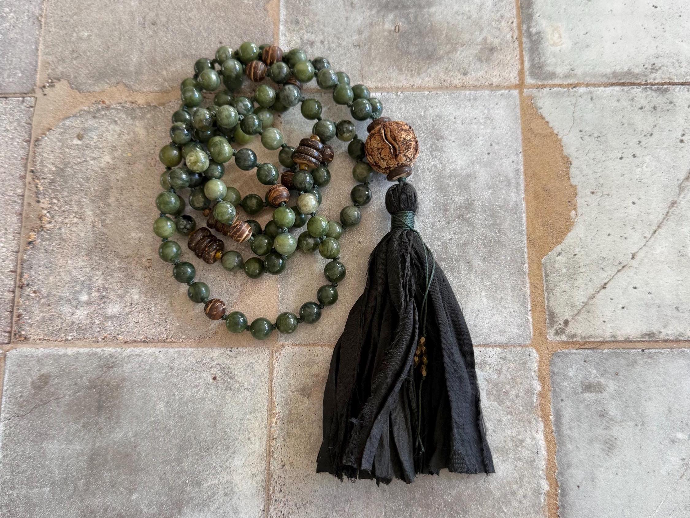 Grounded and elegant, this unisex 108 bead Mala is hand-knotted with Green jade and natural coconut shell beads, featuring a large Mahogany seed bead as the Guru bead. Marker beads are placed every 27 beads, creating a smooth flow for meditation, prayer, or daily wear. The Mala is finished with a black sari silk tassel and decorative string tie with tiny metal beads, adding a touch of refined craftsmanship.