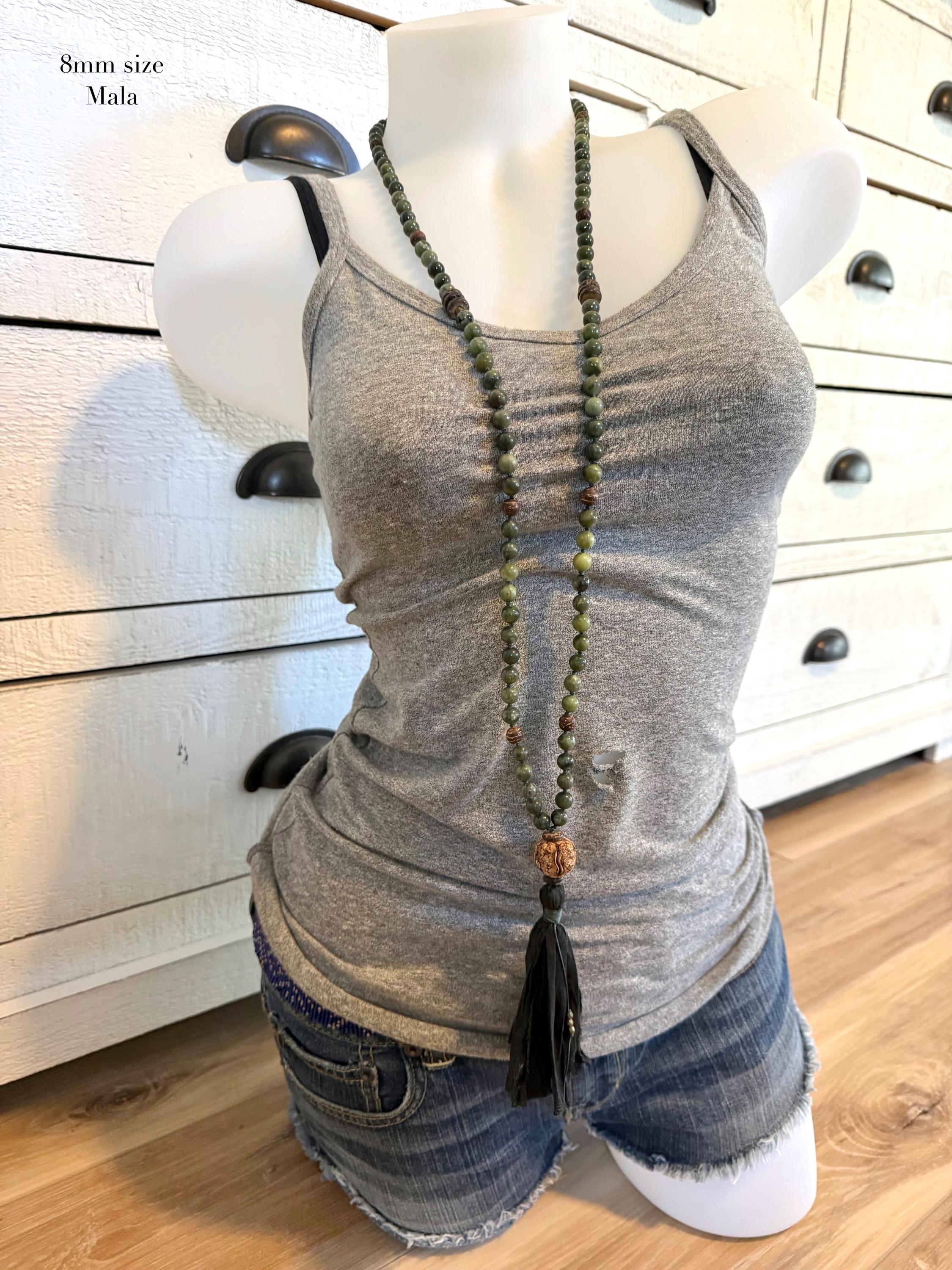 My Malas are available in two sizes: 8mm and 6mm. If you like a lighter or more petite style, the 6mm is a great choice. Each listing shows the Mala on a mannequin and a model so you can get a clear idea of how it looks. If you need guidance, just send me a note—I’m happy to help.