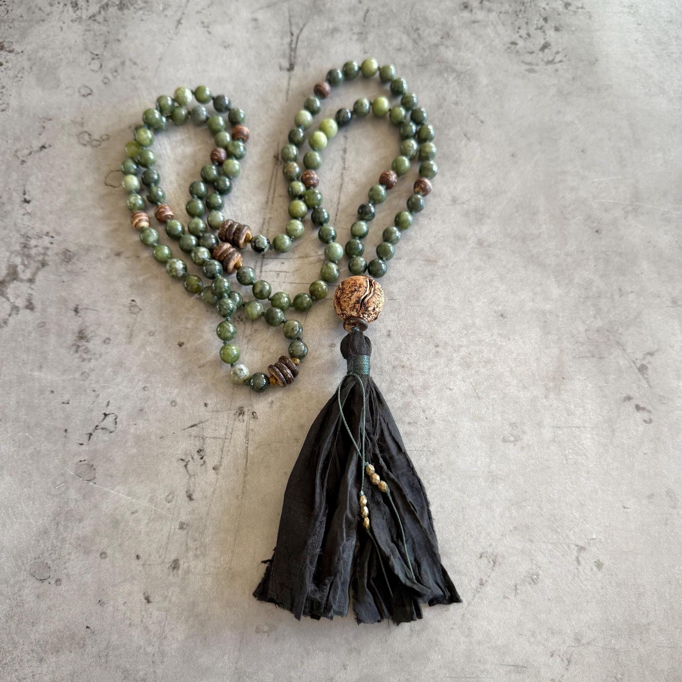 The Mala in these pictures has sold, you will receive a Mala made the same exact way as pictured with materials listed. All natural gemstones beads have their own unique markings and colors, so the Mala you receive will be an original True Nature Jewelry design