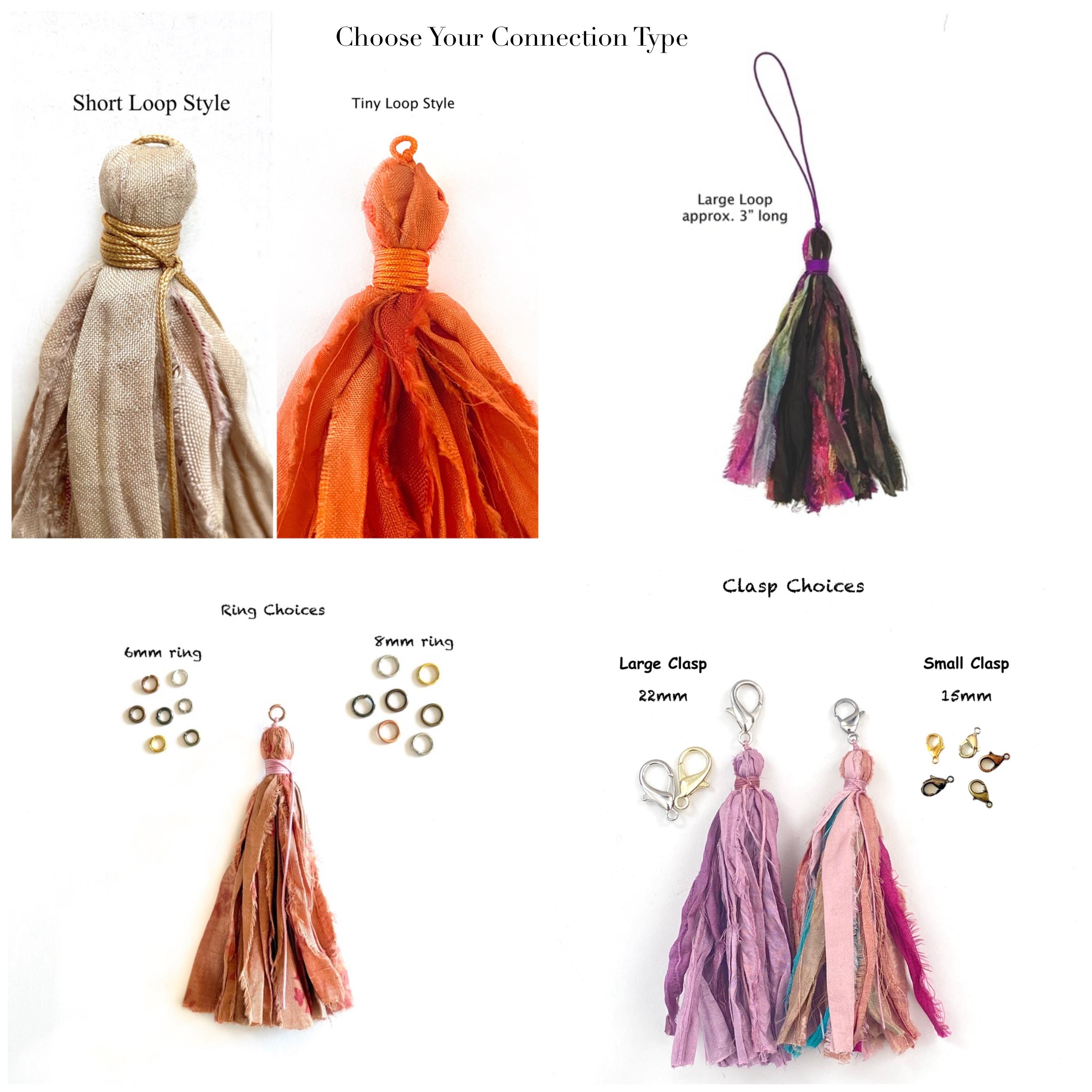 You can choose from 7 attachment types—see listing photos for examples. This allows the tassel to be seamlessly paired with mala necklaces, bracelets, chains, or craft projects.