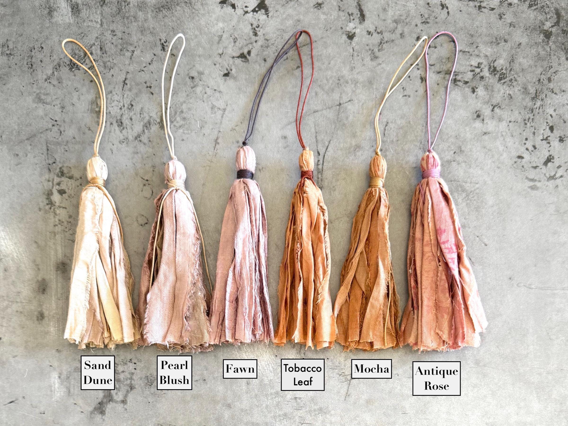 Add color, texture, and intention to your creations with these handmade sari silk tassels. Each tassel is crafted from recycled sari silk fabric remnants from India, giving every piece its own soulful character and beautifully organic feel. These tassels measure approximately 4" long (not including your chosen attachment style), and because each one is handmade, you may request small custom adjustments to length, thickness, or cord color.