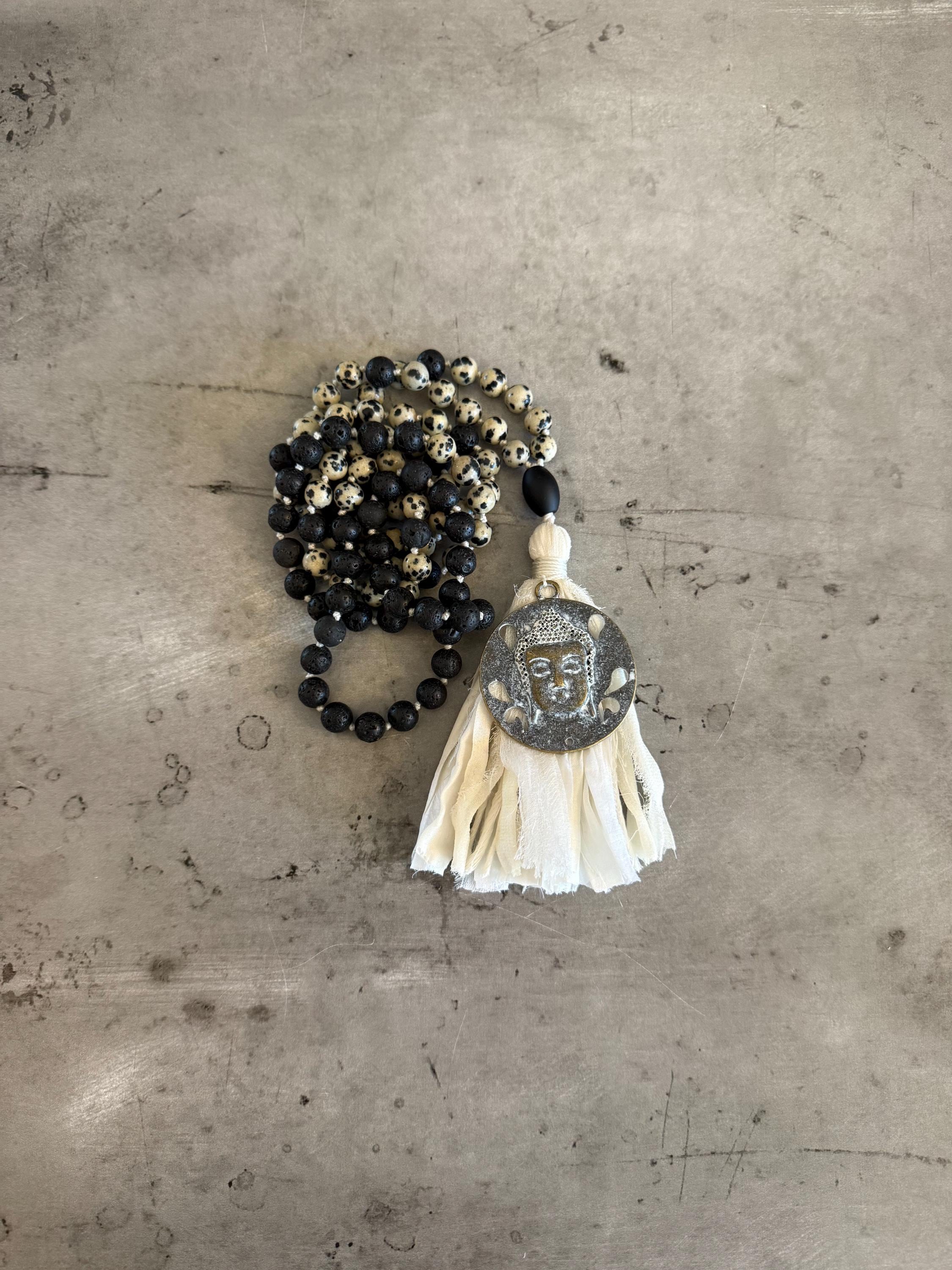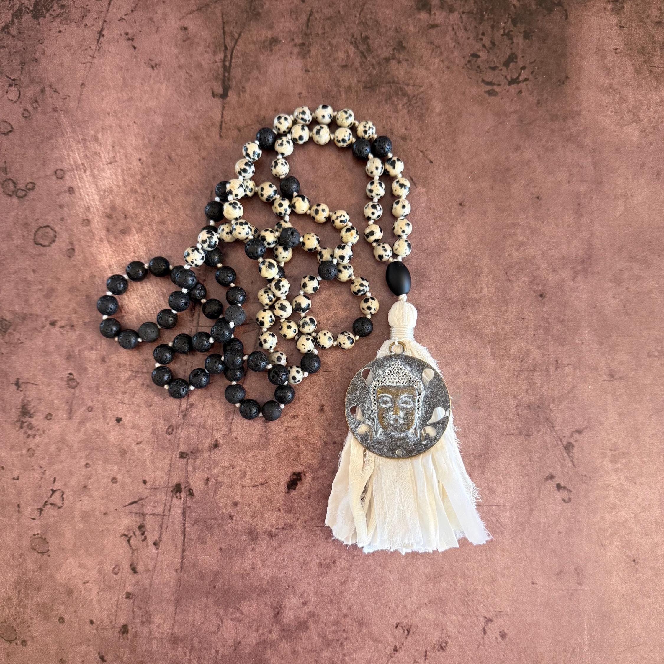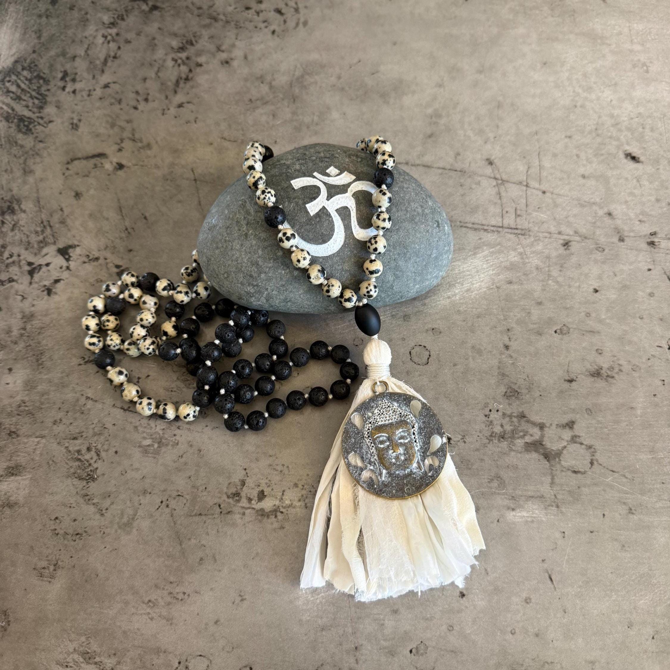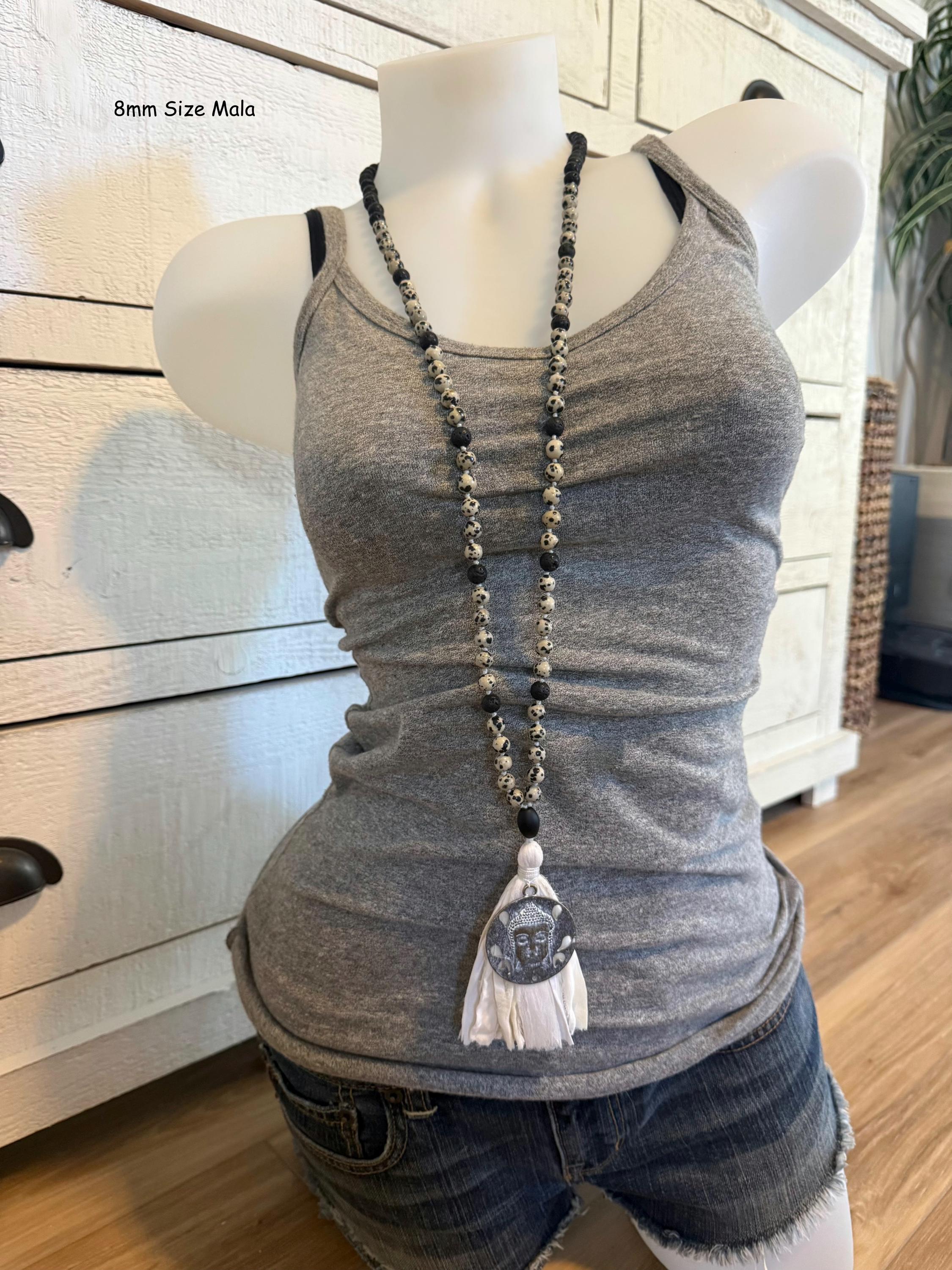 Playful yet grounding, this handcrafted 108 bead Mala blends earthy Dalmatian Jasper with the bold simplicity of Black Onyx.
