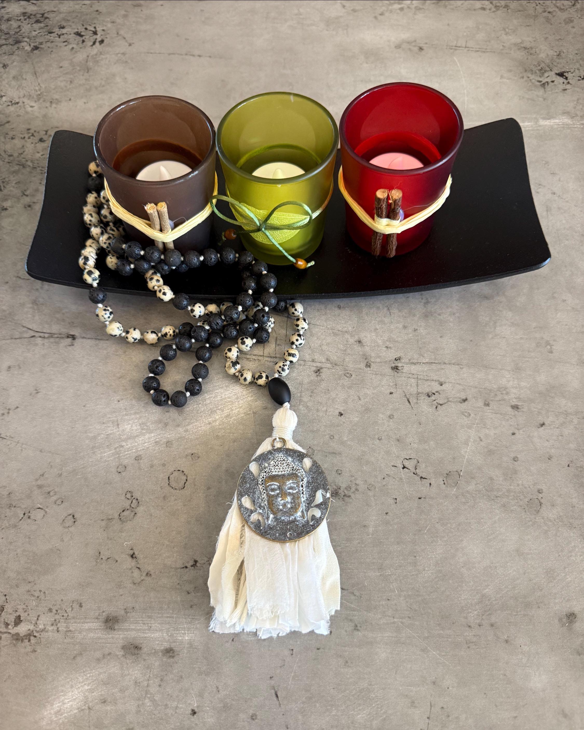 I personally design each Mala, carefully planning and laying out the bead design on a special bead board meant for 108 bead Mala’s. Every bead is hand-knotted by me for flexibility and beauty. I also create the tassels myself using Sari silk fabric, silk thread, cotton or other natural fibers. I can attach a pendant to any Mala if you choose not to have a tassel