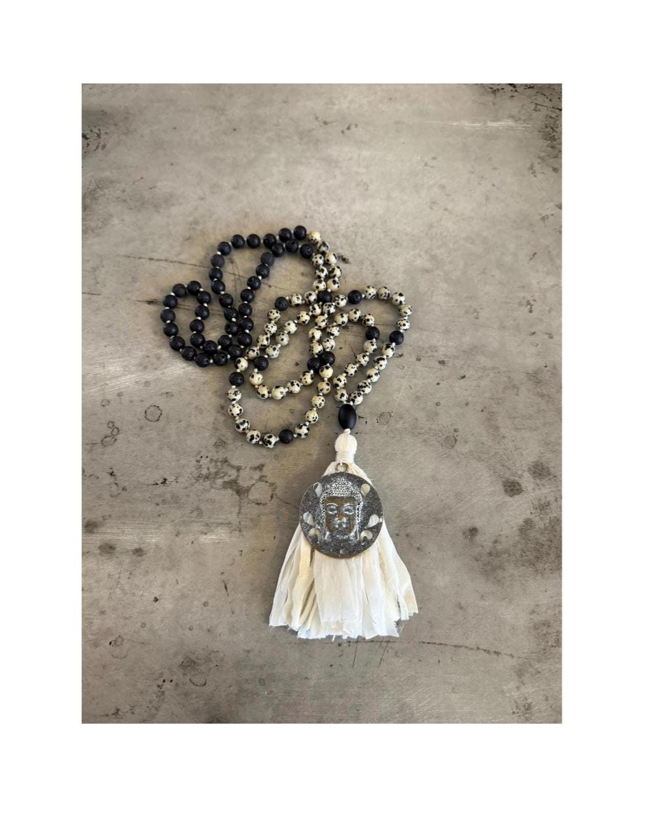 Designed to bring balance and intention into your daily practice, each bead is individually hand-knotted, creating a smooth, flowing drape and a calming rhythm for meditation or wear. Finished with a handmade Sari silk tassel, this Mala also offers the option to include a Buddha pendant for an added symbolic touch