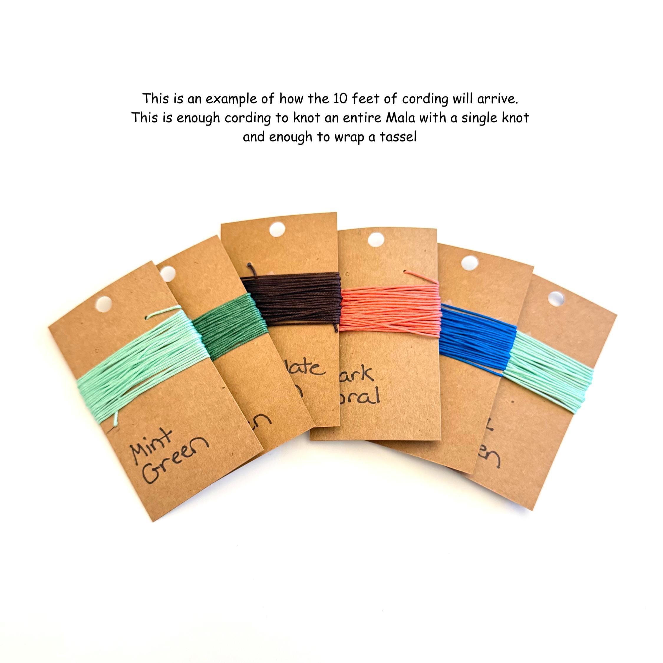 If you are purchasing this cording to make your own Mala you will receive 120 inches ( 10 ft. ) of knotting cord. This is plenty of cording to knot and entire Mala along with enough cording to wrap around a tassel. If you plan to use a double knot your Mala or use more than 108 beads you will need more cording. This size cord works perfectly for a 1mm drilled bead hole which is the most common size bead hole sold and used for making a Mala. Clear nail polish on the ends works well for getting it through the beads.