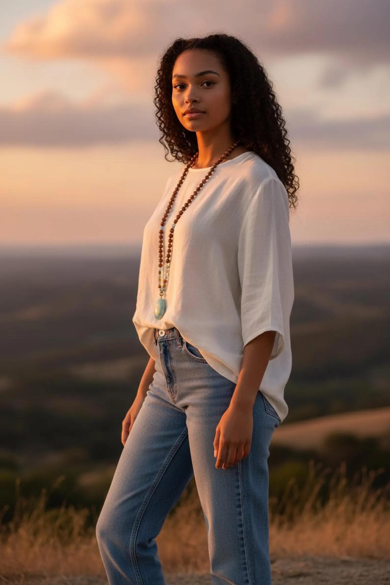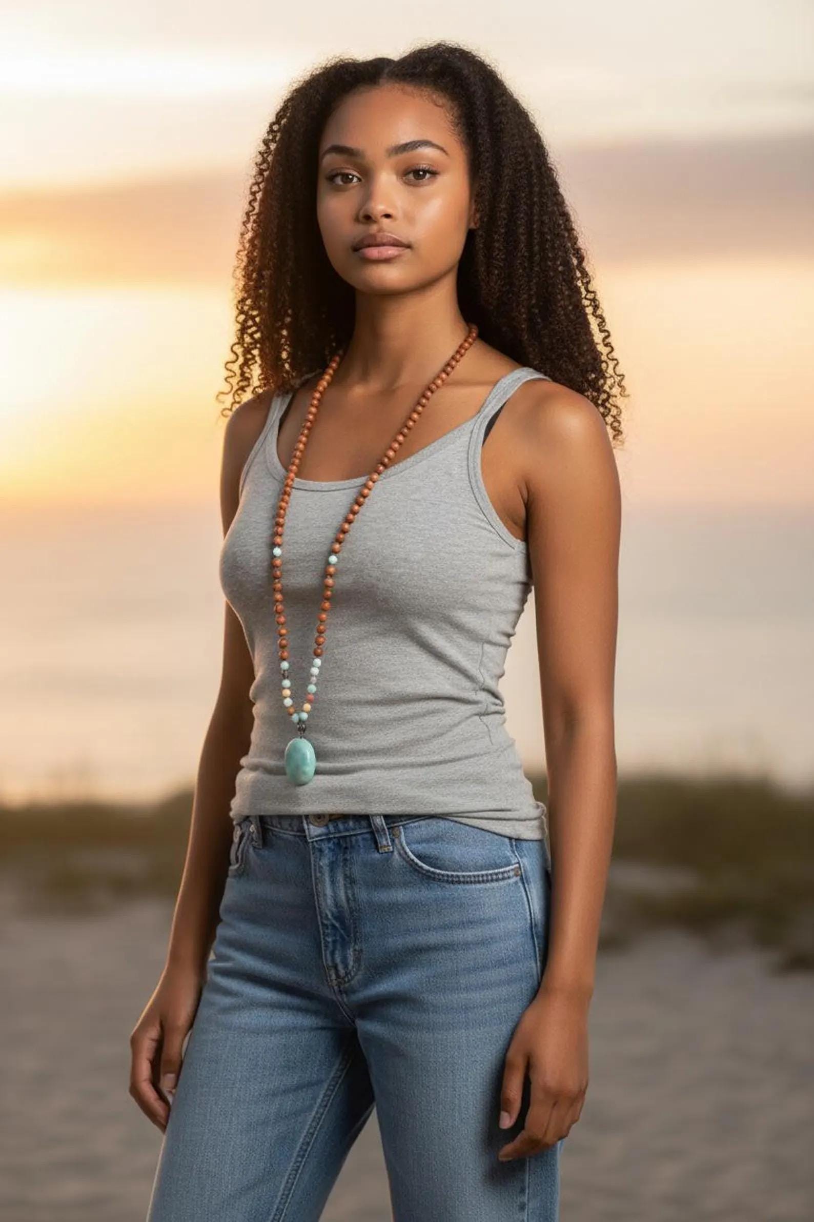 Natural and versatile, this 108 bead Mala is hand-knotted from Sandalwood, matte Amazonite, and Hematite, finished with a large Amazonite pendant of your choice. You can select from a variety of unique pendants to make the mala truly your own. Sandalwood is often connected with calm and clarity, Amazonite with peace and balance, and Hematite with grounding and protection—creating a soothing and supportive combination. This customizable Mala is a meaningful piece for meditation, mindfulness, or as a special gift.
