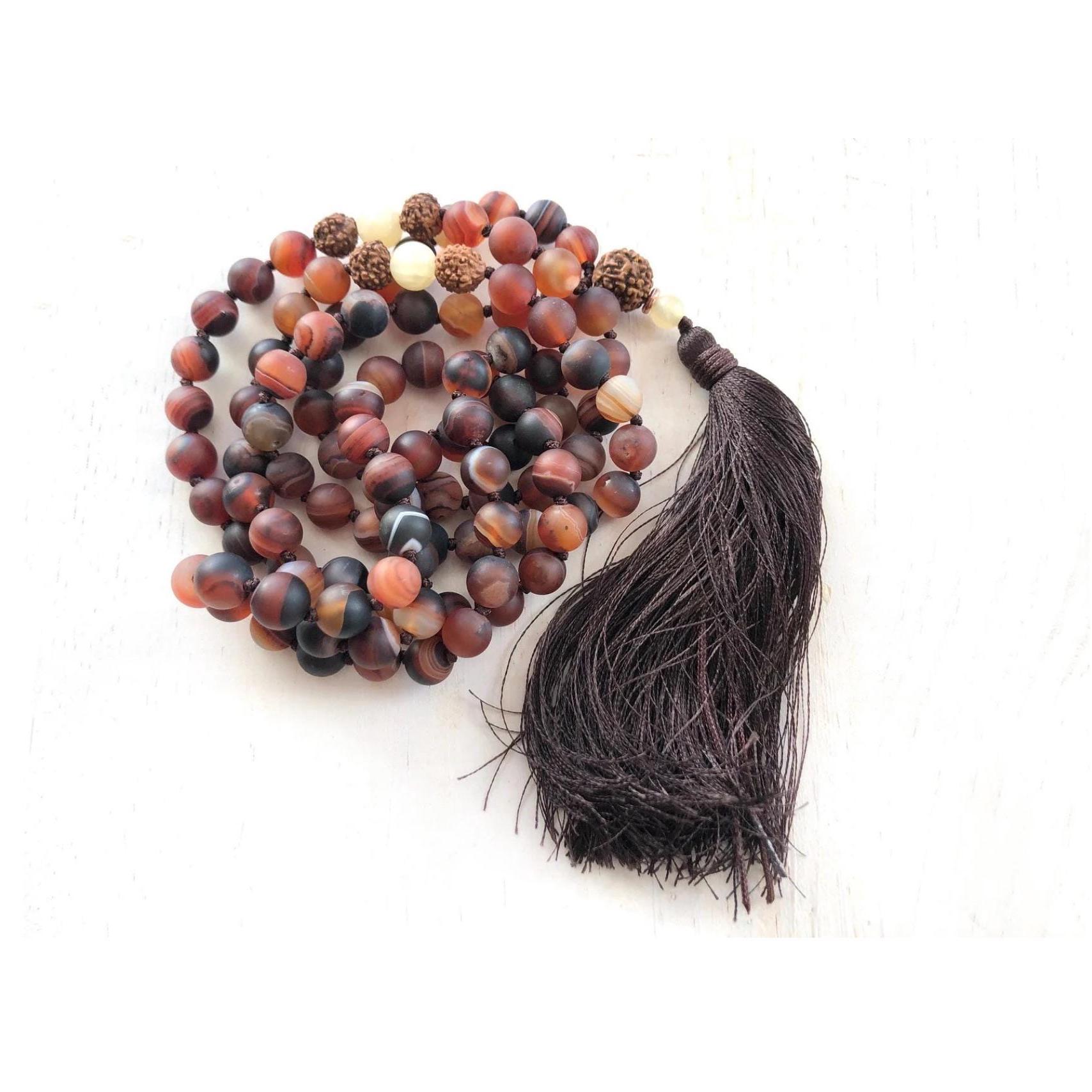Warm and balanced, this 108 bead Mala necklace is hand-knotted from matte Dream Agate, Yellow Jade, and Rudraksha, finished with a Rudraksha Guru bead and a soft silk thread tassel. These materials are often connected with harmony and spiritual focus—Dream Agate is associated with protection and grounding, Yellow Jade with positivity and wisdom, and Rudraksha with peace and devotion. Natural and meaningful, this Mala is a beautiful choice for meditatio or daily mindfulness. A variety of different tassel choices are available, you choose the look you like best at checkout
