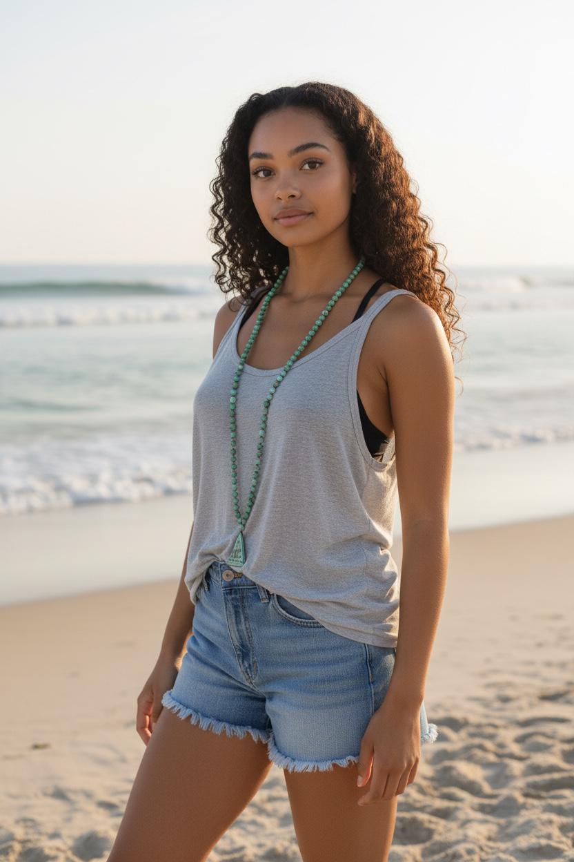 Earthy and distinctive, this 108 bead Mala necklace is hand-knotted from matte African Turquoise and finished with a unique triangle brass patina Buddha pendant. African Turquoise is often connected with growth, transformation, and balance, making it a meaningful stone for meditation and personal journey. With its bold pendant and grounding energy, this Mala is a beautiful choice for mindfulness, spiritual practice, or as a one-of-a-kind jewelry piece.