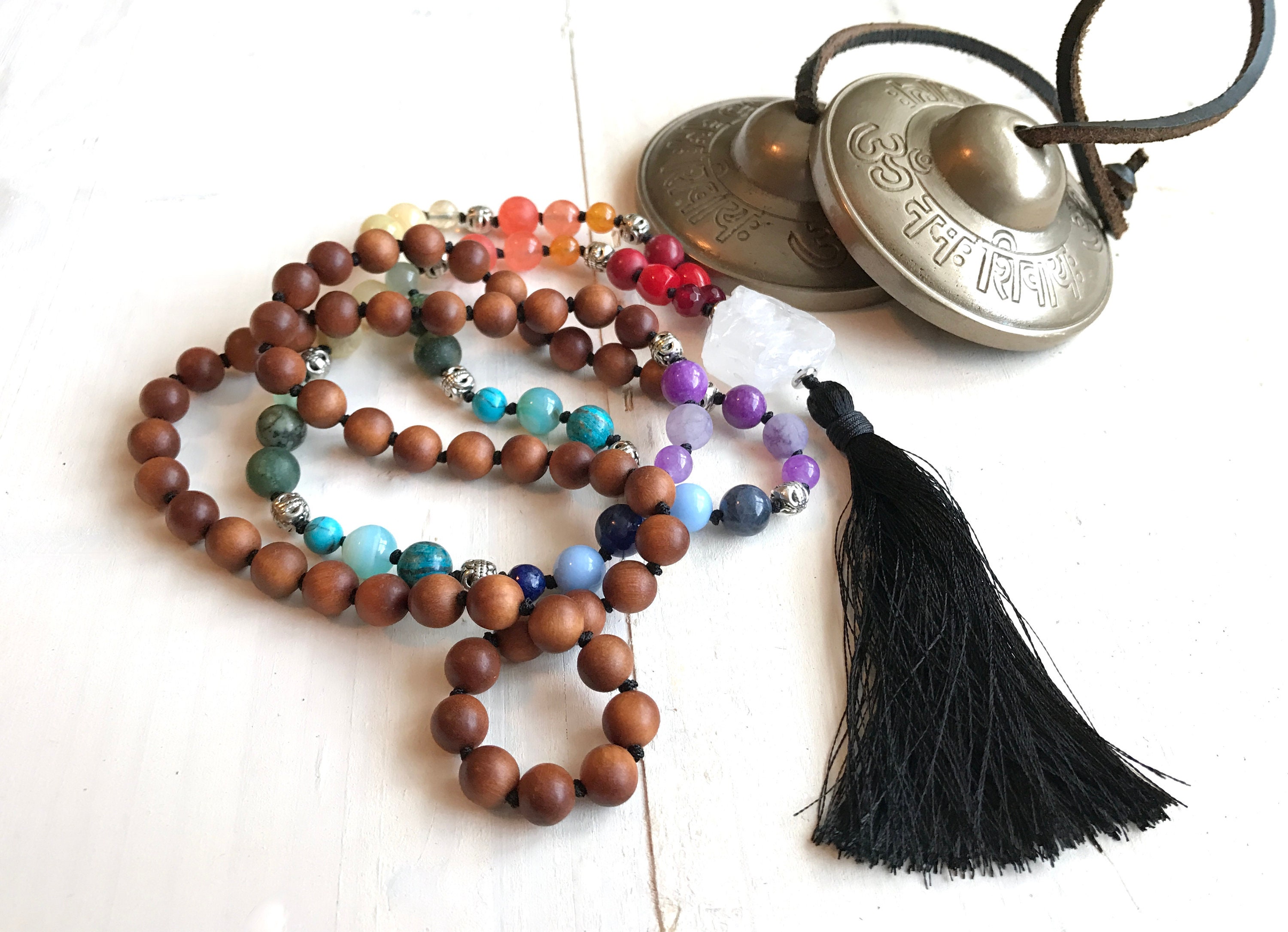 Vibrant and full of meaning, this 108 bead Chakra Mala necklace is hand-knotted from a mix of 6mm and 8mm gemstone beads in the colors of all seven Chakras, made with Sandalwood and accented with decorative metal beads. It is finished with a large raw Clear Quartz Guru bead and can be customized with or without a tassel, with tassel choices available. These stones are often connected with balance and energy, while Sandalwood is valued for its grounding and sacred qualities, and Clear Quartz is associated with clarity and amplification. Designed as a versatile and symbolic piece, this <ala is a beautiful companion for meditation or mindfulness while wearing daily