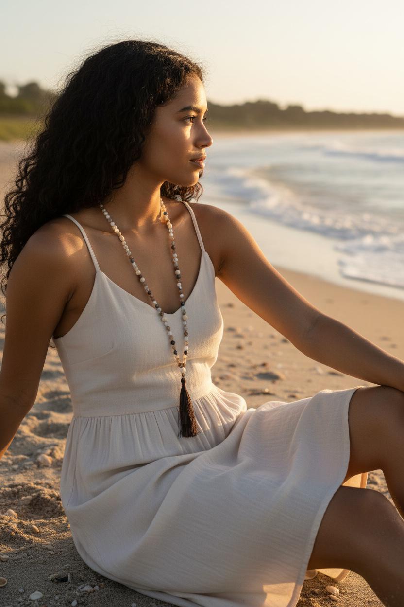 I personally design each Mala, carefully planning and laying out the bead design on a special bead board meant for 108 bead Mala’s. Every bead is hand-knotted by me for flexibility and beauty. I also create the tassels myself using Sari silk fabric, silk thread, cotton or other natural fibers. I can attach a pendant to any Mala if you choose not to have a tassel