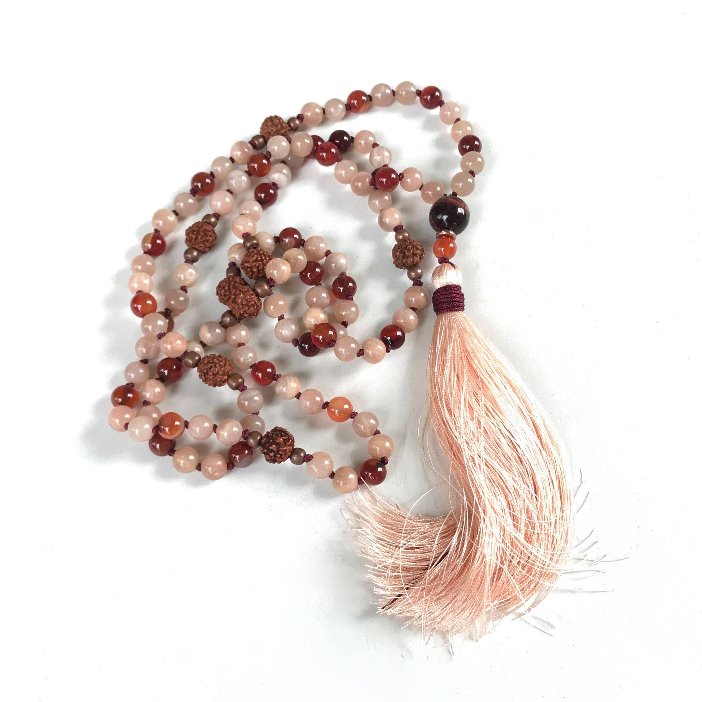 Radiant and grounding, this 108 bead Mala necklace is hand-knotted from Sunstone, Dream Agate, and Rudraksha, finished with a Red Tiger Eye Guru bead and a soft silk thread tassel. These materials are often connected with balance and vitality—Sunstone is associated with joy and energy, Dream Agate with harmony and protection, Rudraksha with spiritual focus, and Red Tiger Eye with strength and confidence. With its mix of vibrant and soft colors, this Mala is a meaningful choice for meditation, mindfulness. A variety of different tassel choices are available, you choose the look you like best