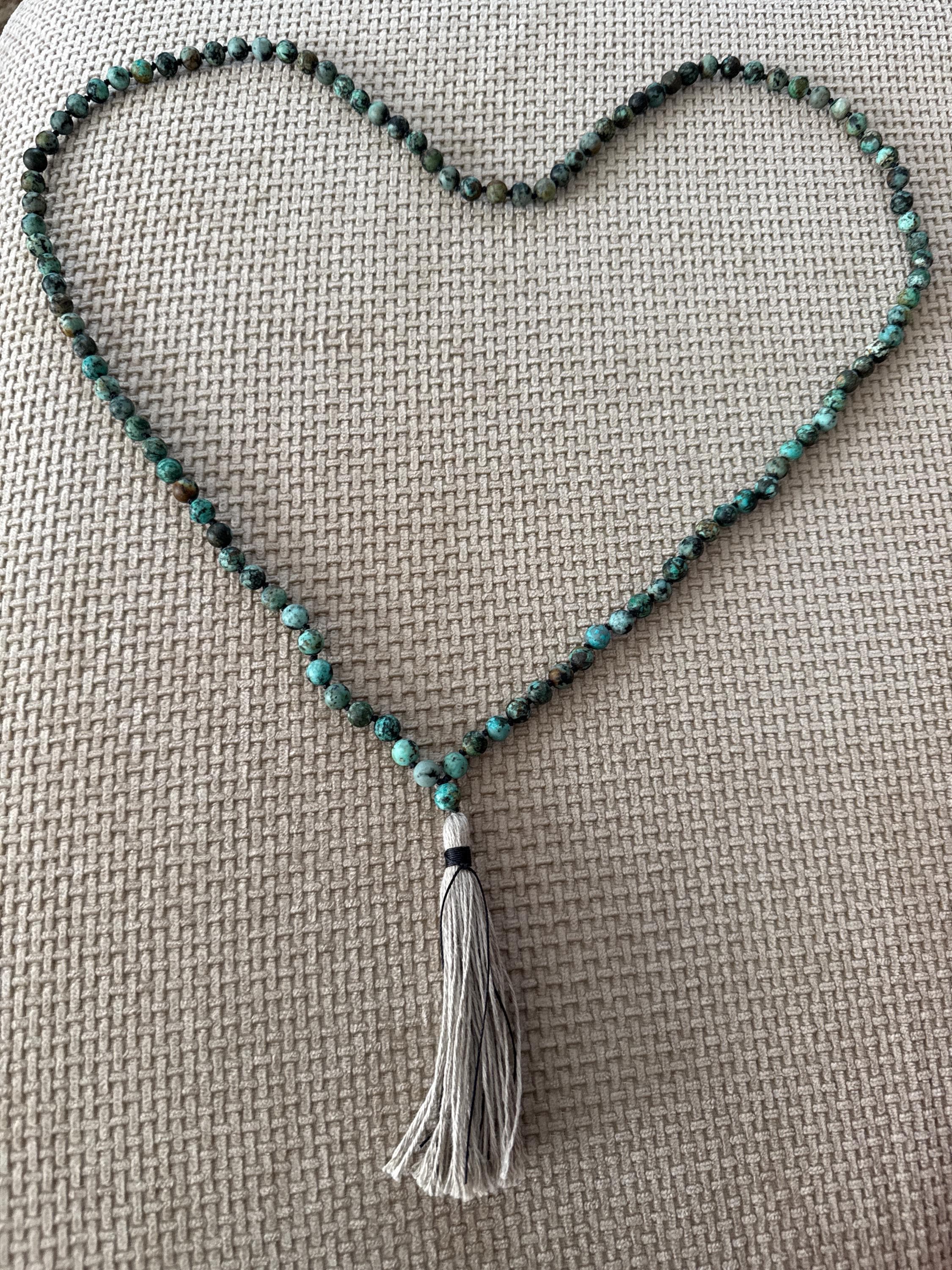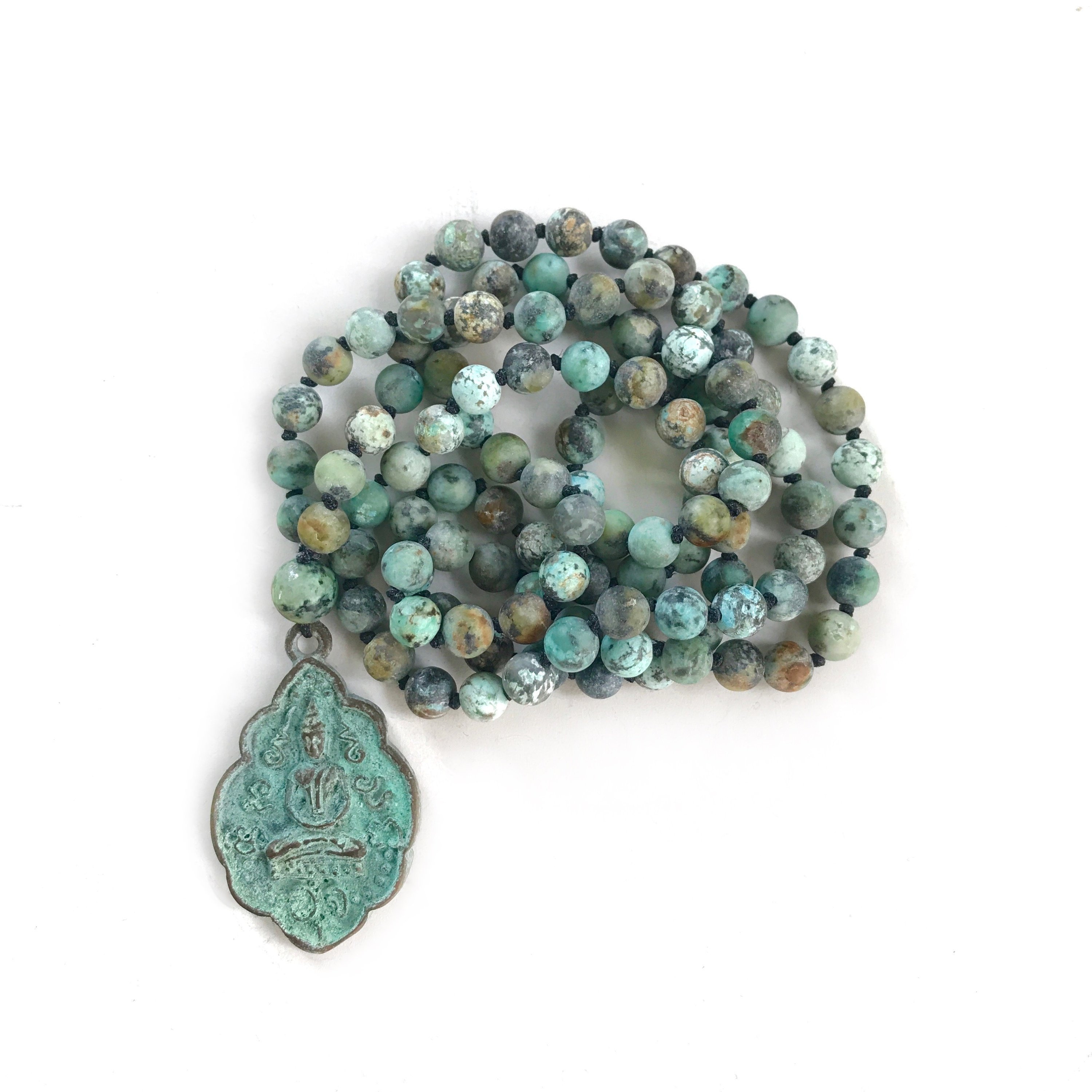 Grounding and protective, this 108 bead Mala is hand-knotted with matte African Turquoise, a stone known for its connection to growth, transformation, and inner balance. The soothing green-blue tones of African Turquoise bring a sense of calm while inspiring positive change and renewal. At the end hangs a brass patina Buddha pendant, symbolizing wisdom, mindfulness, and spiritual awakening. This Mala can be used in meditation, worn as a reminder of your intentions, or given as a special gift. A versatile and soulful accessory that supports grounding energy and personal transformation.