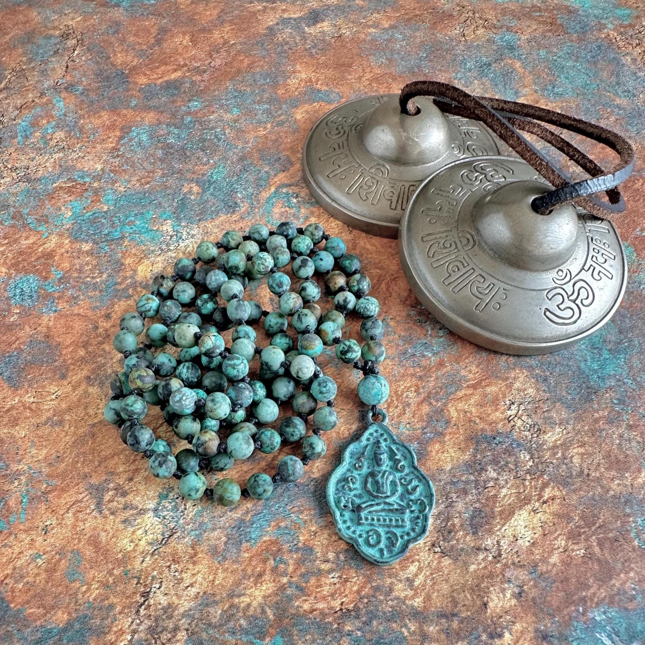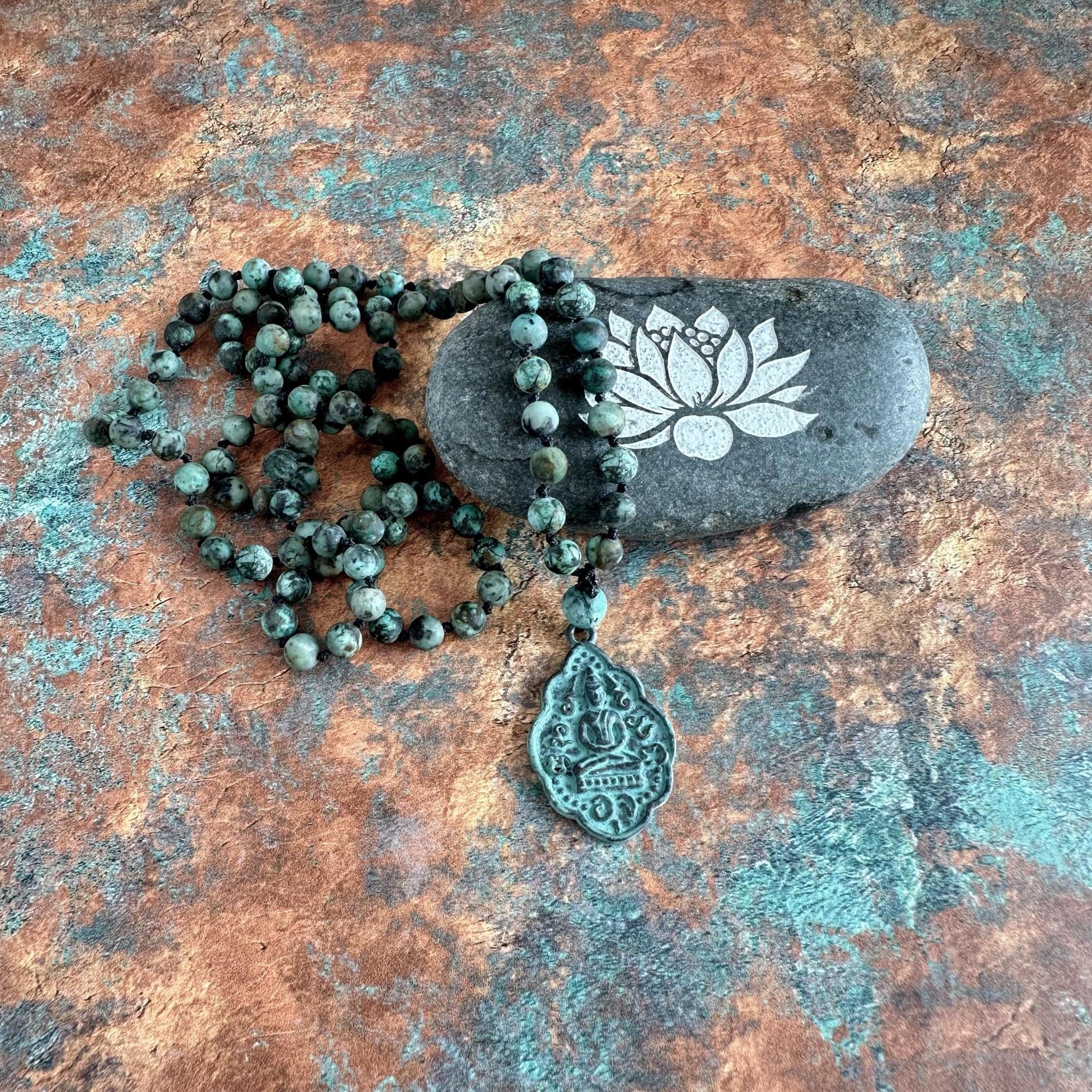 Grounding and protective, this 108 bead Mala is hand-knotted with matte African Turquoise, a stone known for its connection to growth, transformation, and inner balance. The soothing green-blue tones of African Turquoise bring a sense of calm while inspiring positive change and renewal. A brass patina Buddha pendant finishes off this design, symbolizing wisdom, mindfulness, and spiritual awakening. This Mala can be used in meditation, worn as a reminder of your intentions, or given as a special gift. A soulful Mala that supports grounding energy and personal transformation.
