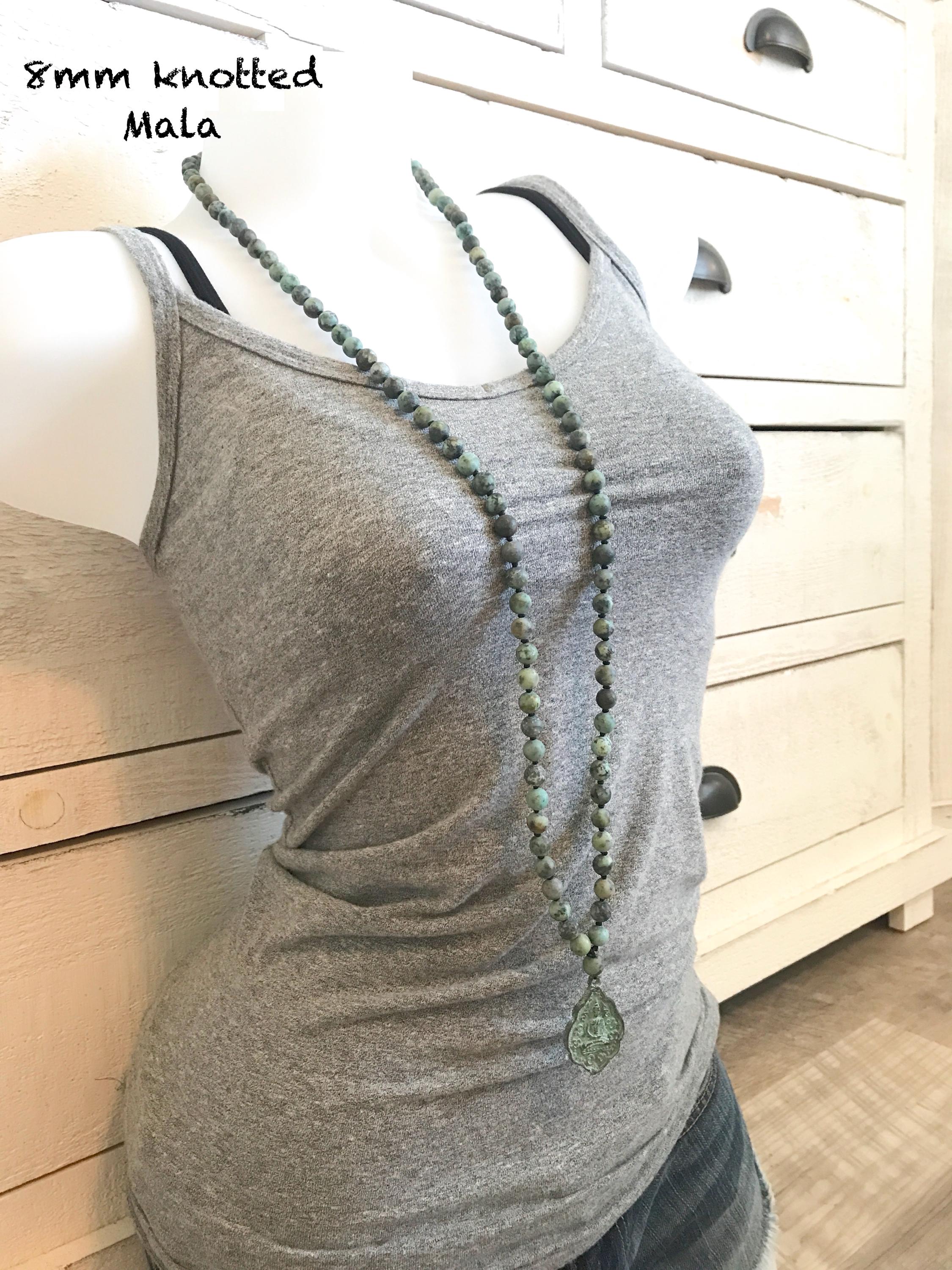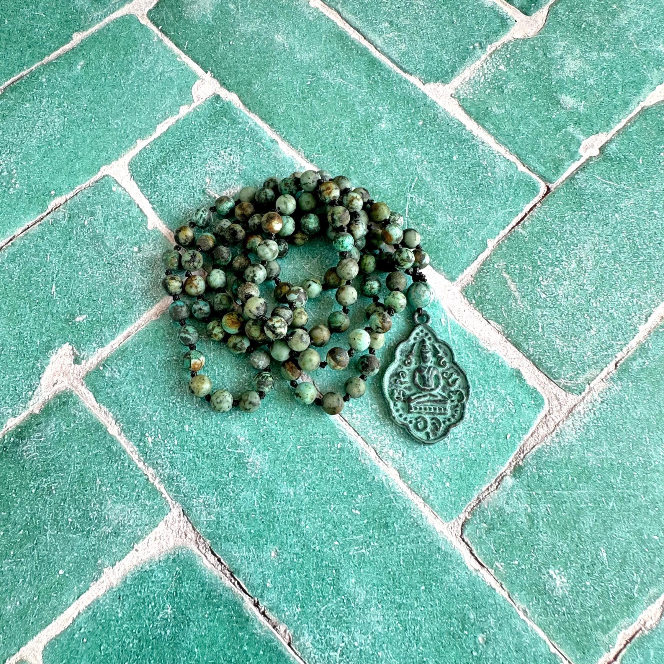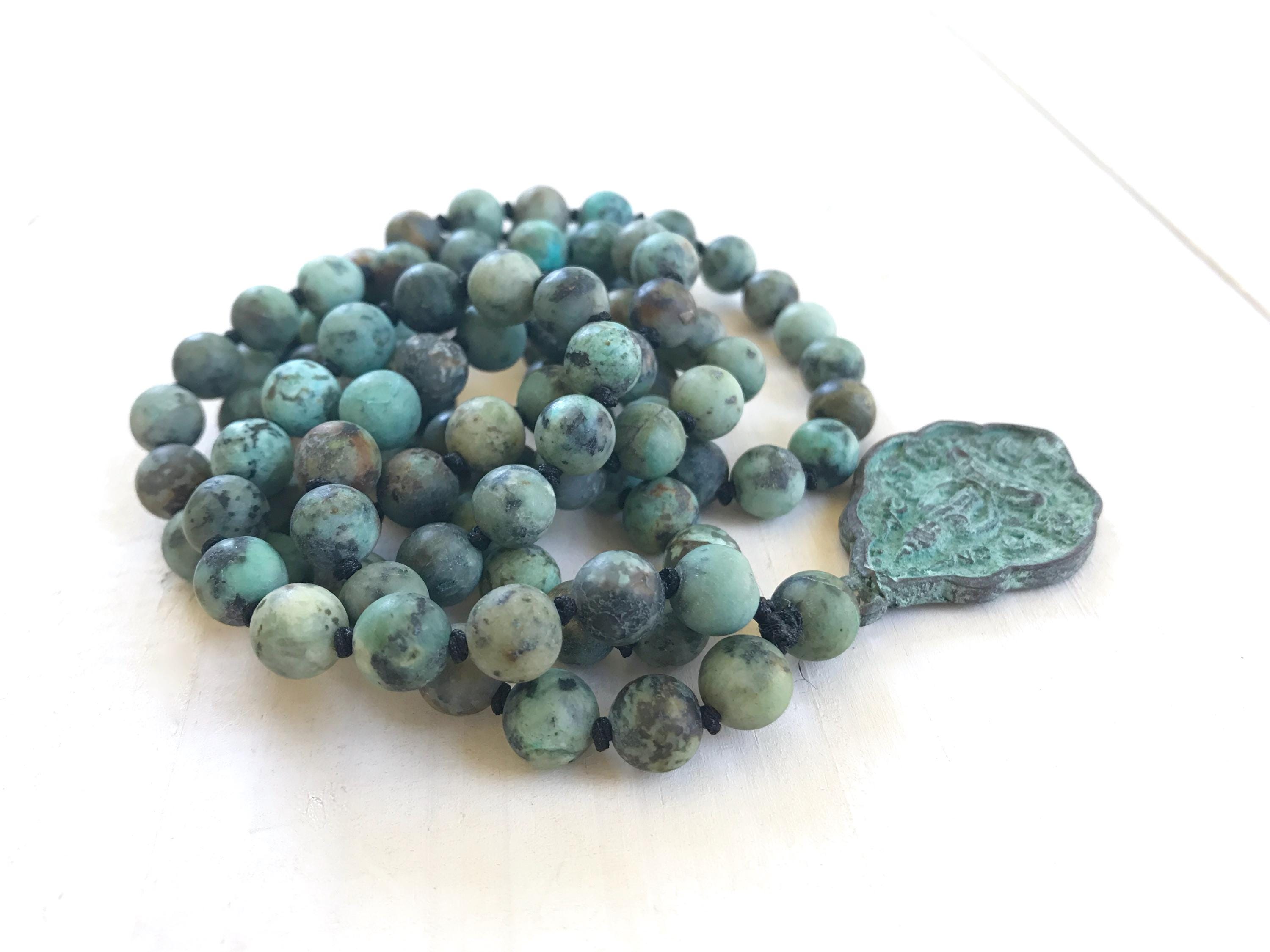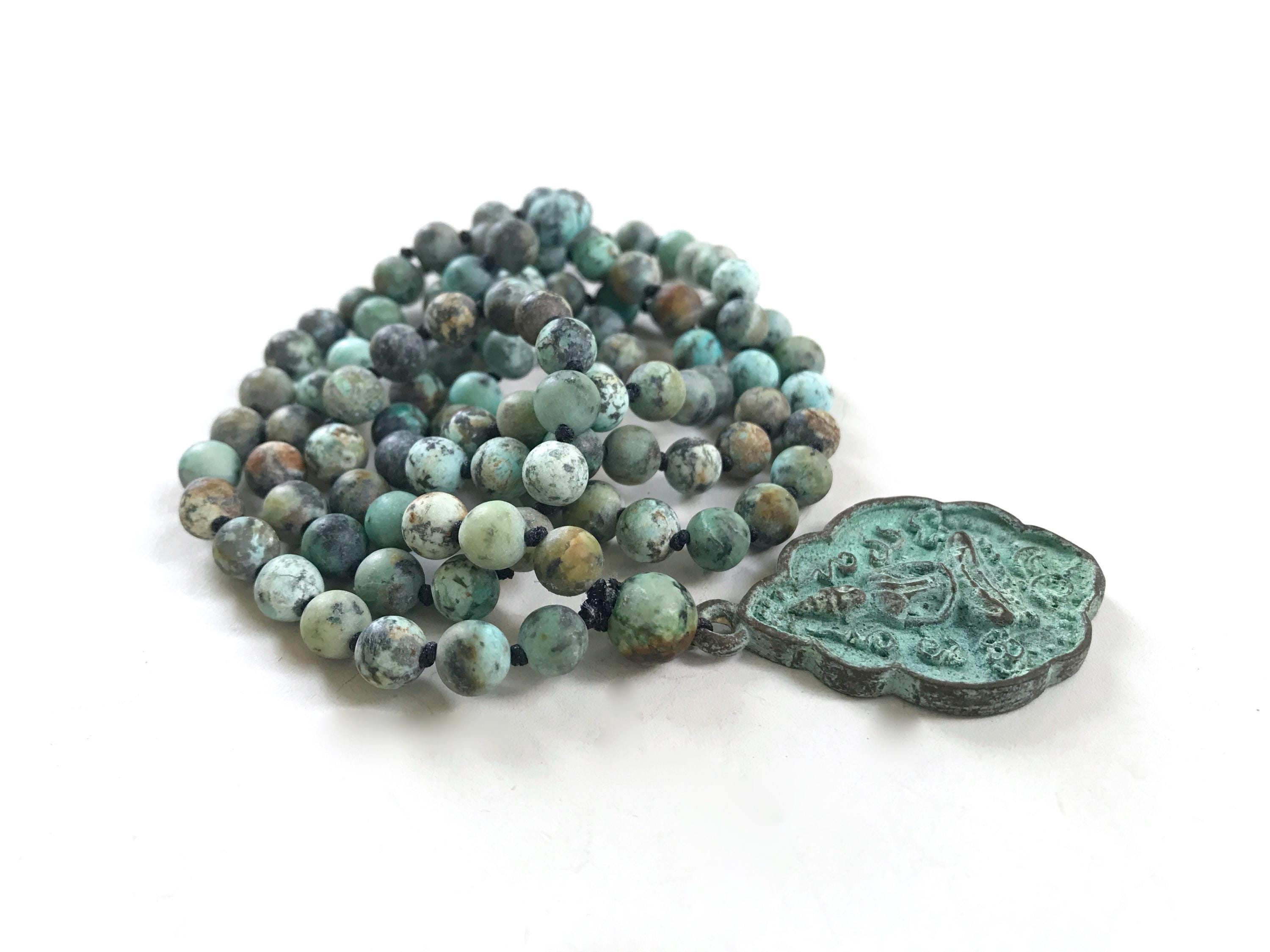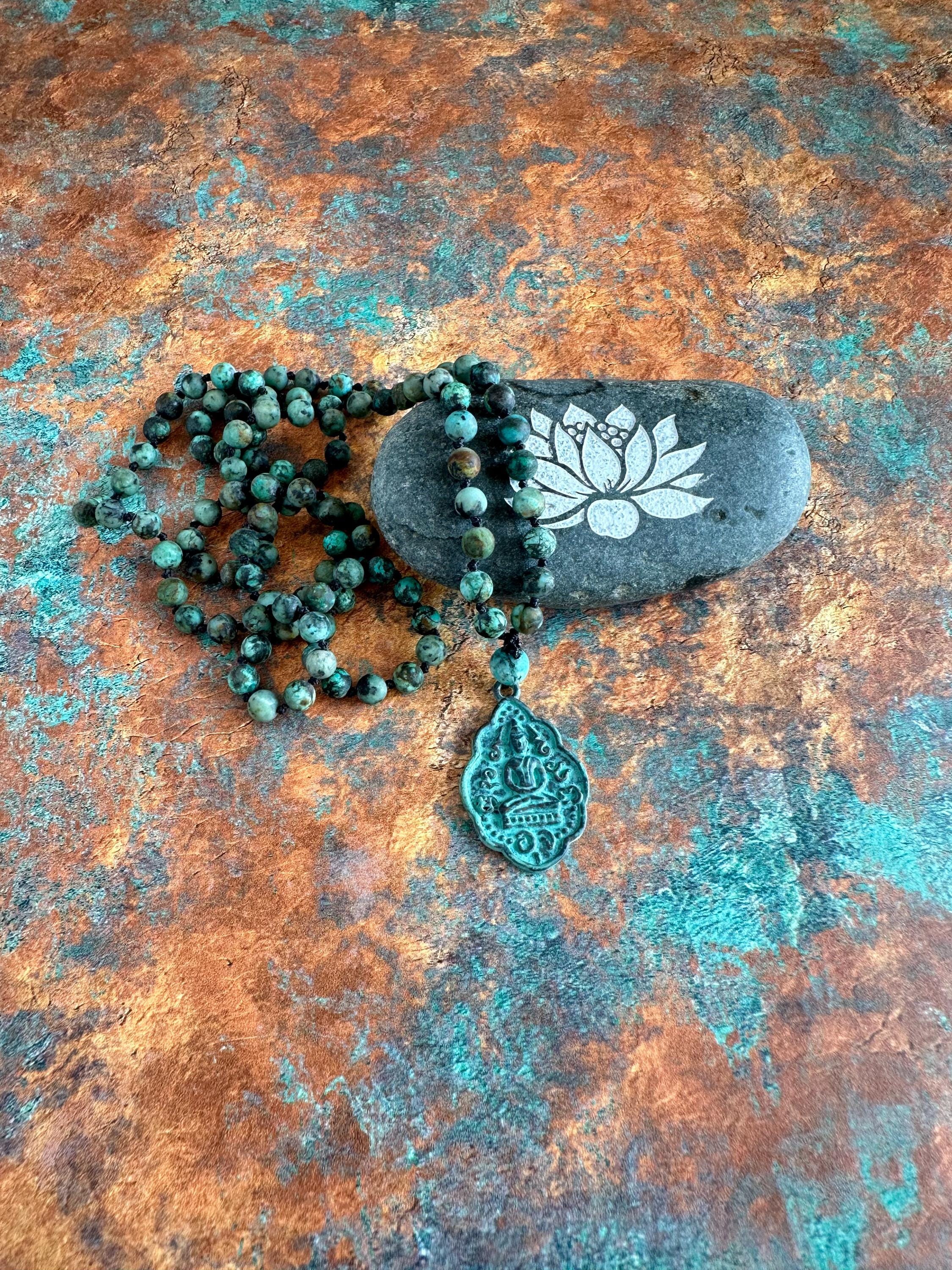 Grounding and protective, this 108 bead Mala is hand-knotted with matte African Turquoise, a stone known for its connection to growth, transformation, and inner balance. The soothing green-blue tones of African Turquoise bring a sense of calm while inspiring positive change and renewal. At the end hangs a brass patina Buddha pendant, symbolizing wisdom, mindfulness, and spiritual awakening. This Mala can be used in meditation, worn as a reminder of your intentions, or given as a special gift. A versatile and soulful accessory that supports grounding energy and personal transformation.