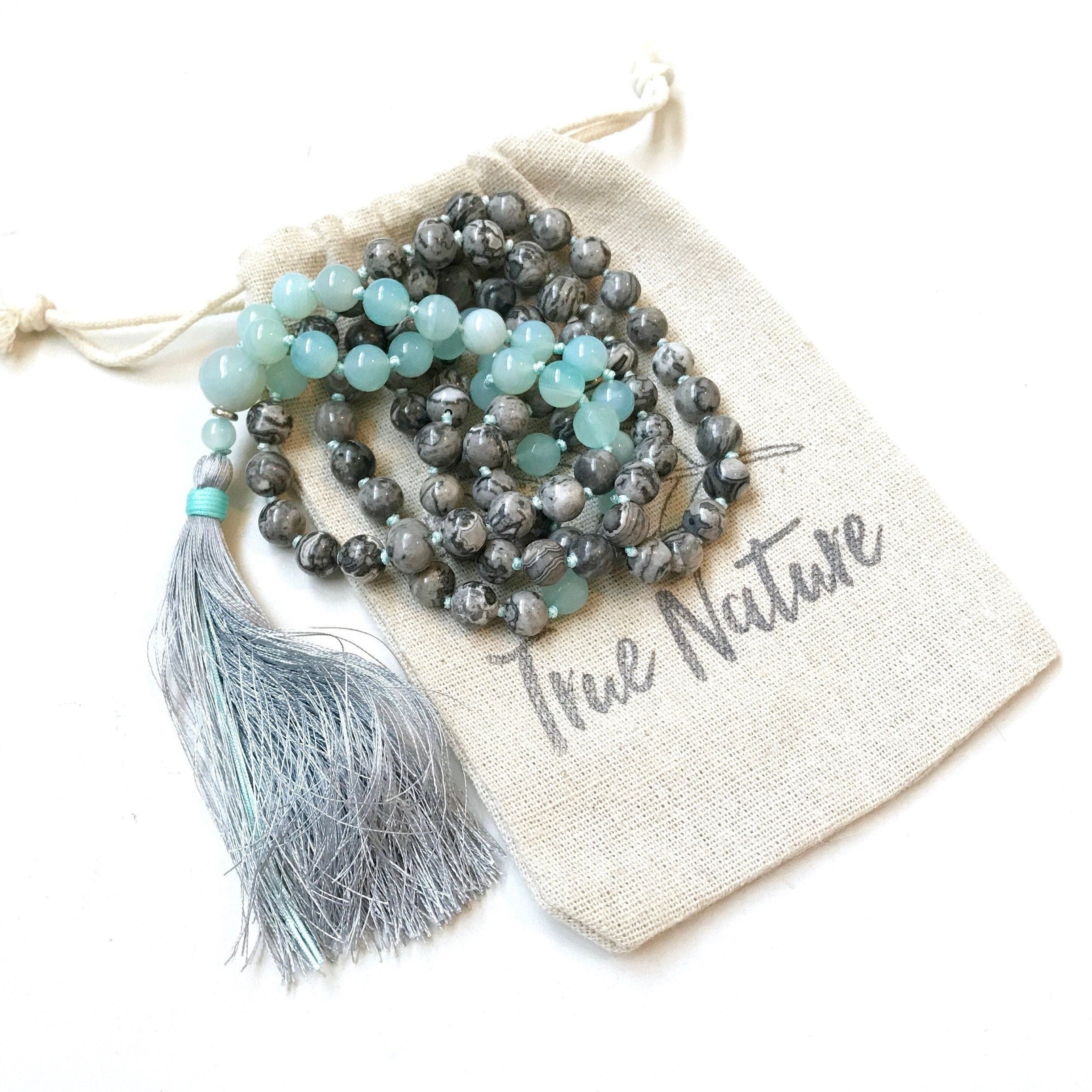 Grounded yet refreshing, this 108 bead Mala is hand-knotted with Gray Picasso Jasper and faceted Amazonite, creating a striking balance of earthy tones and soft Aqua hues. It is finished with a bold Aqua Striped Agate Guru bead that brings a vibrant focal point to the design. A silk thread tassel completes the piece, with other tassel options available for personalization. This Mala is a meaningful choice for meditation, mindfulness, or as a unique gift idea.