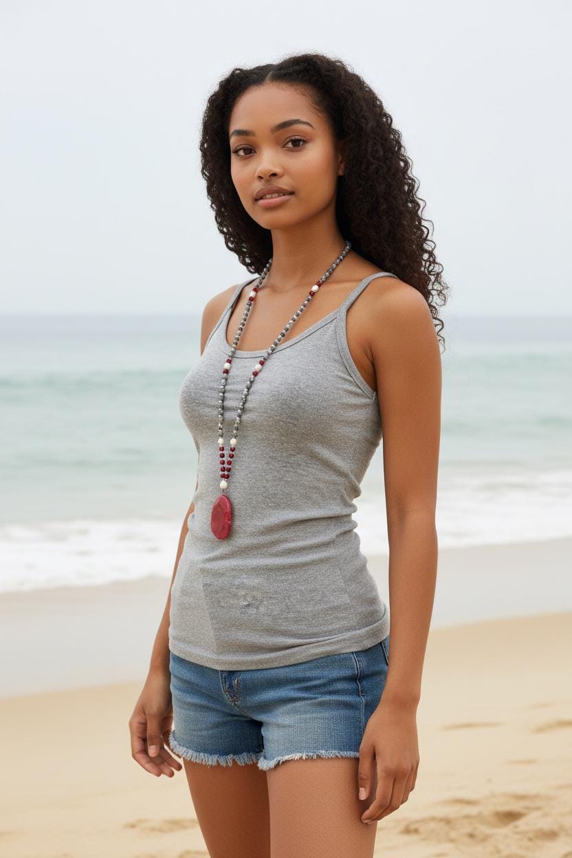 Grounded and eye-catching, this 108 bead Mala necklace is hand-knotted from Scenery Jasper, faceted Quartzite, and Howlite, finished with a large bold Red faceted Agate pendant. These stones are often connected with balance and clarity—Scenery Jasper is associated with stability and connection to the earth, Quartzite with energy and focus, and Howlite with peace and calm. The striking Red Agate pendant adds strength and vitality, making this Mala a meaningful choice for meditation, mindfulness, or as a unique jewelry piece.
