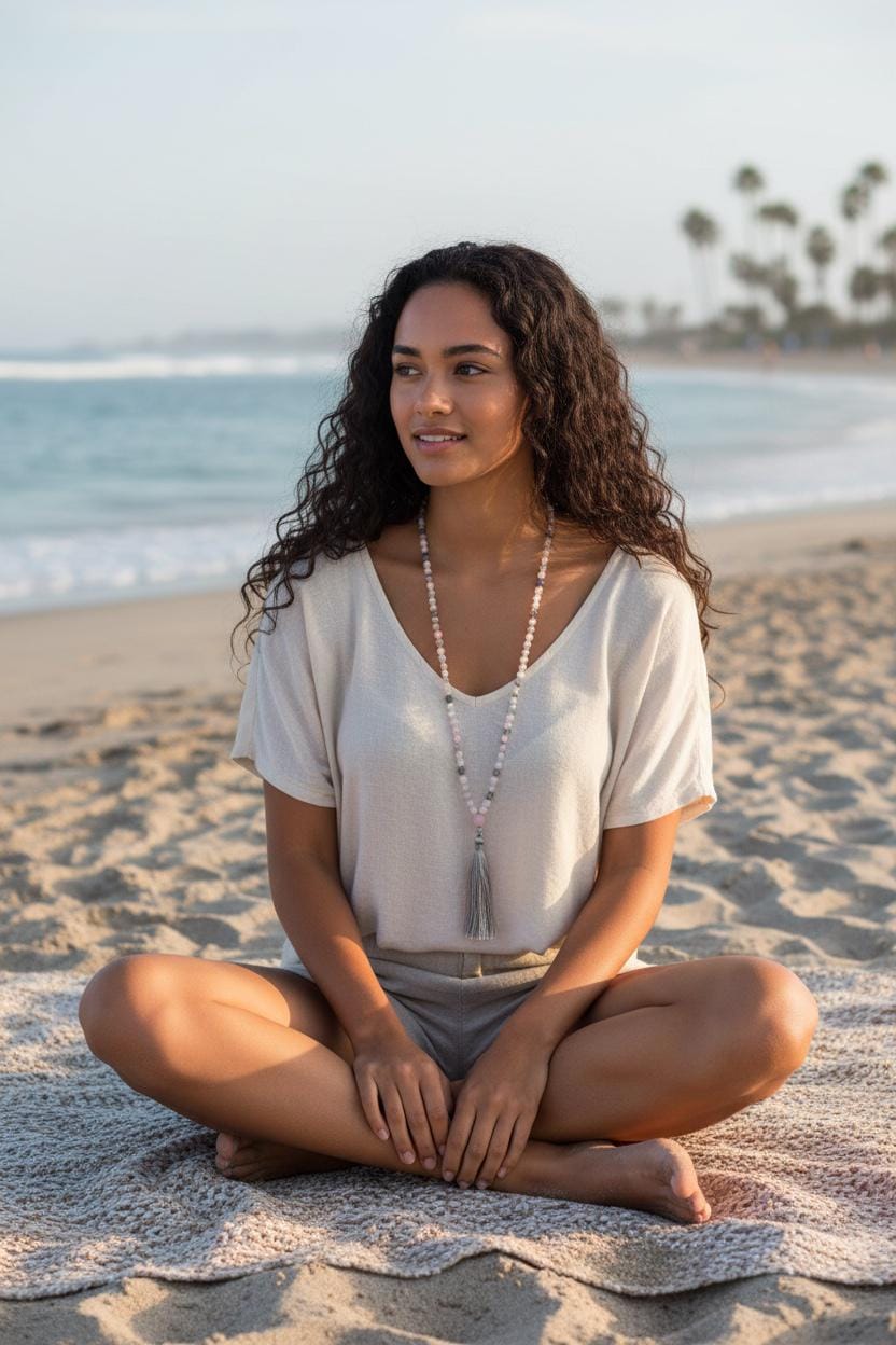 I personally design each Mala, carefully planning and laying out the bead design on a special bead board meant for 108 bead Mala’s. Every bead is hand-knotted by me for flexibility and beauty. I also create the tassels myself using Sari silk fabric, silk thread, cotton or other natural fibers. I can attach a pendant to any Mala if you choose not to have a tassel